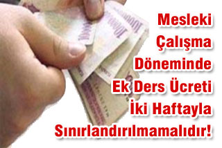 Ögretmenler geçen dönem ders kesimi tarihinden sonra 15-19, 22-26 ve 29-30 Haziran tarihlerinde mesleki çalisma yaptilar. Iki haftaya ait ek ders ücretini alan ögretmenler, 29-30 Haziran tarihlerine ait ek ders ücretini ise alamadilar.