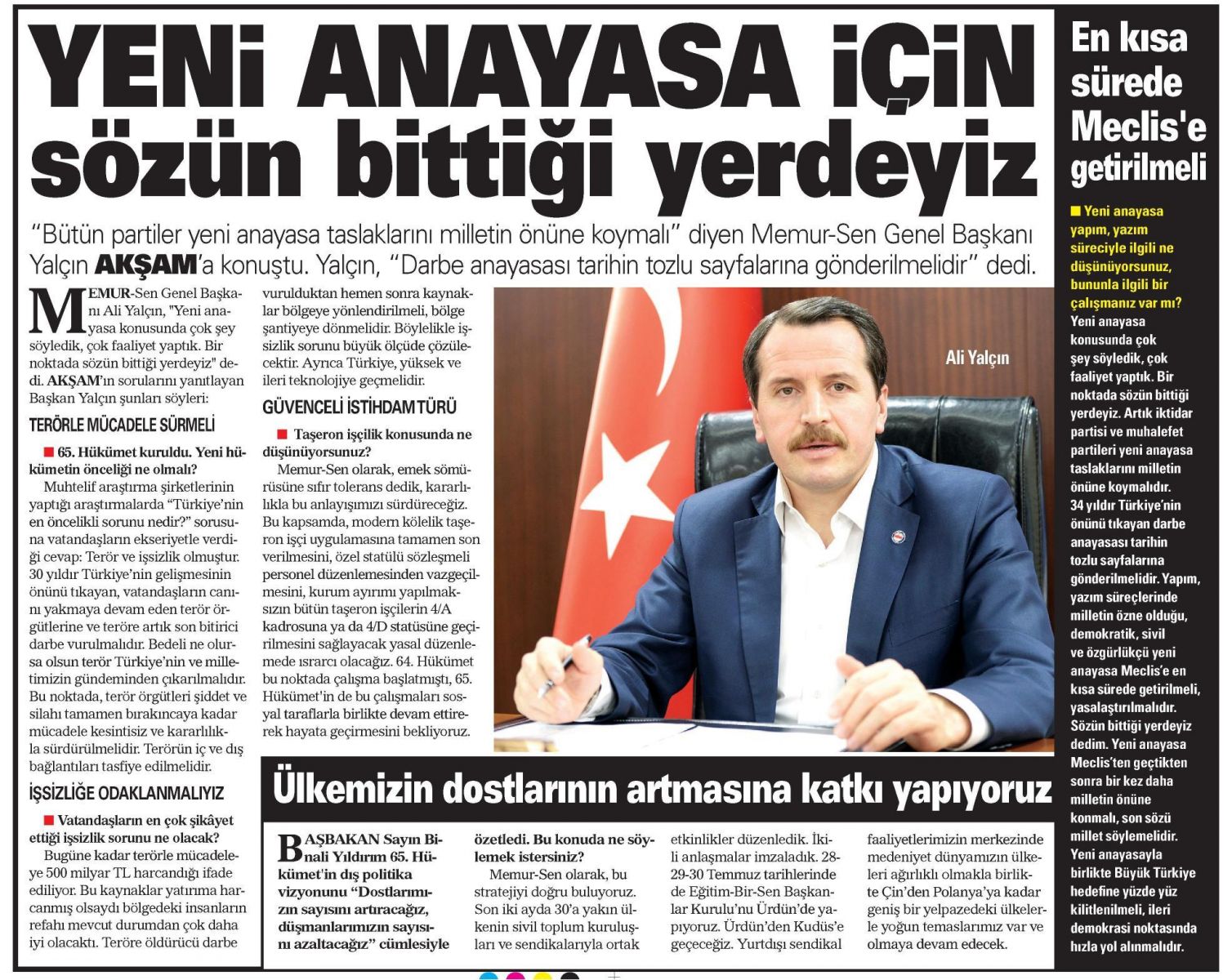 Akşam ve Güneş Gazetesi'nin sorularını cevaplandıran Eğitim-Bir-Sen ve Memur-Sen Genel Başkanı Ali Yalçın, "Terörle mücadelede başarılı olunması halinde terörle mücadeleye harcanan kaynaklar yatırıma yönlendirilecektir. Bugüne kadar terörle mücadeleye 500 milyar TL harcandığı ifade ediliyor. Bu kaynaklar yatırıma harcanmış olsaydı bölgedeki insanların refahı mevcut durumdan çok daha iyi olacaktı. Teröre öldürücü darbe vurulduktan hemen sonra kaynaklar bölgeye yönlendirilmeli, bölge şantiyeye dönmelidir. Böylelikle işsizlik sorunu büyük ölçüde çözülecektir" dedi.