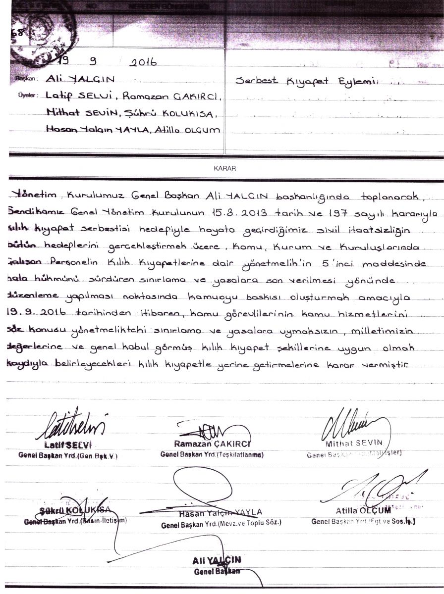 “Genel Yönetim Kurulu, 15.03.2013 tarih ve 197 sayılı kararıyla kılık-kıyafet serbestîsi hedefiyle hayata geçirdiğimiz sivil itaatsizliğin bütün hedeflerini gerçekleştirmek üzere, kamu görevlilerinin kılık-kıyafetlerine dair yönetmeliğin 5. maddesinde hâlâ hükmünü sürdüren sınırlama ve yasalara son verilmesi yönünde düzenleme yapılması noktasında kamuoyu baskısı oluşturmak amacıyla 19.09.2016 tarihinden itibaren, kamu görevlilerinin, kamu hizmetlerini söz konusu yönetmelikteki sınırlama ve yasalara uymaksızın, milletimizin değerlerine ve genel kabul görmüş kılık-kıyafet şekillerine uygun olmak kaydıyla belirleyecekleri kılık-kıyafetle yerine getirmelerine karar vermiştir.”