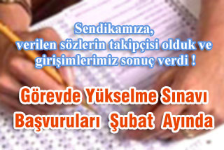 2 Temmuz 2009 tarihinde Milli Egitim Bakani Nimet Çubukçu’dan yardimci hizmetler sinifi çalisanlari için Görevde Yükselme Sinavi sözünü almistik. Agustos ayinda Milli Egitim Bakanligi yetkilileri ile yaptigimiz görüsmelerde sinav sürecinin bir an önce baslatilmasini istemistik. Bakanlik yetkilileri ise; seflerin egitimi, sinav ve atama sürecine müteakip, Yardimci Hizmetler Sinifi çalisanlari için sinav sürecini baslatacaklarini söylemislerdi.