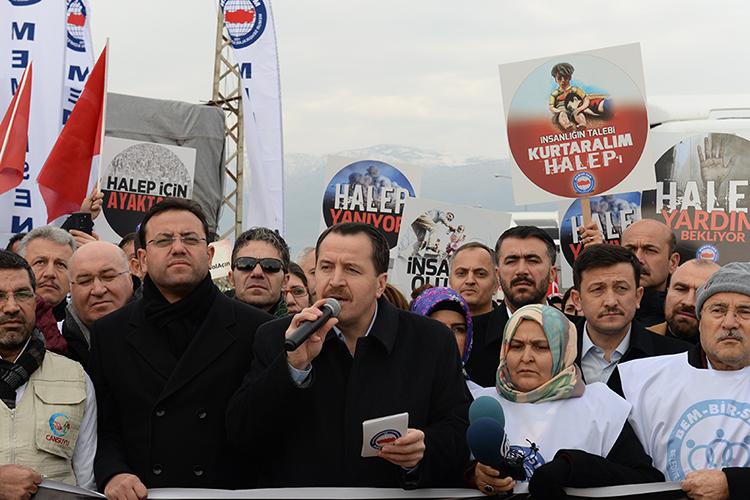 81 İlden “Halep’e Yol Açın” sloganıyla konvoylarla Hatay’a ulaşan Memur-Senlilere hitap eden Eğitim-Bir-Sen ve Genel Başkanı Ali Yalçın, “TIR’lara insanlığı yükledik ve ‘Yükümüz İnsanlık Yönümüz Halep. İyiliği Yüklendik Halep’e Yöneldik’ diyerek insanlık için, barış için, adalet için ayağa kalktık. Gün bugündür; Zulme karşı adaleti, baskıya karşı özgürlüğü, zillete karşı onuru seçmiş Halep halkına sahip çıkmalıyız. Haleplilerin savaş uçakları, tankları, füzeleri, fosfor ve misket bombaları yoktur. Onlar imanı, iradesi, sabrı ve kararlılığı var. Zalimlerin yaktığı Halep, Allah’ın izniyle küllerinden dirilecektir. Lanet olsun Halep’te soykırım tezgâhı açanlara” dedi.
