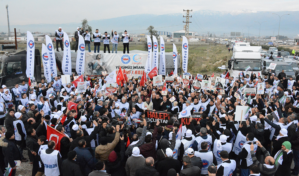 “Halep’i Açlıktan İnsanlığı Utançtan Kurtar” eylem planı çerçevesinde daha önce; yardım çağrısı yapıldı, 81 ilde yardım seferberliği başlatıldı, tüm illerde 'Gıyabi Cenaze Namazı kılındı, ortak basın açıklamaları gerçekleştirildi, İstanbul Tünelden Galatasaray Lisesi’ne kadar Halep yürüyüşü düzenlendi ve Uluslararası Kuruluşlara Halep’e duyarlılık çağrısı yapıldı. Memur-Sen beş aşamalı eylem planı çerçevesinde bugün yardım konvoylarıyla sınıra dayandı. “Halep’e Yol Açın” sloganıyla 81 ilden yola çıkan Memur-Sen’liler yardım TIR'larıyla berber Hatay’a ulaştı. Memur-Sen konvoyu Hatay araç muayene istasyonu önünden Cilvegözü sınır kapısına doğru yol aldı. 81 ilden gelen binlerce konvoyu karşılayan Memur-Sen Genel Başkanı Ali Yalçın, burada basın açıklaması yaptı. Halep’e yol açmak için seferde olduklarını belirten Yalçın, “TIR’lara insanlığı yükledik ve ‘Yükümüz İnsanlık Yönümüz Halep. İyiliği Yüklendik Halep’e Yöneldik’ diyerek insanlık için, barış için, adalet için ayağa kalktık. Gün bugündür; Zulme karşı adaleti, baskıya karşı özgürlüğü, zillete karşı onuru seçmiş Halep halkına sahip çıkmalıyız. Haleplilerin savaş uçakları, tankları, füzeleri, fosfor ve misket bombaları yoktur. Onlar imanı, iradesi, sabrı ve kararlılığı var. Zalimlerin yaktığı Halep, Allah’ın izniyle küllerinden dirilecektir. Lanet olsun Halep’te soykırım tezgahı açanlara” dedi.