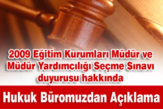 2009 Egitim Kurumlari Müdür ve Müdür Yardimciligi Seçme Sinavi duyurusu yapildiktan sonra üyelerimizden tereddüt edilen hususlarla ilgili telefon ve e-mailler almaktayiz. Gelen telefon ve e-mailler dikkate alinarak, Hukuk Büromuz tarafindan tereddüt edilen bazi konularla ilgili bir degerlendirme yapilmistir.