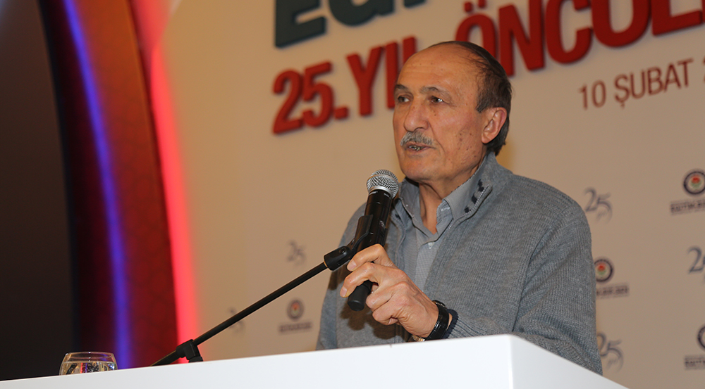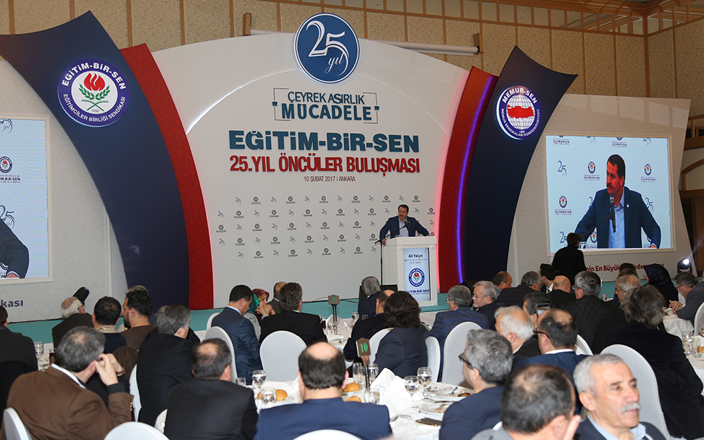 Eğitim-Bir-Sen Onursal Başkanı, Ankara Milletvekili Ahmet Gündoğdu, sendikanın kuruluş yıllarında karşılaşılan sorun ve engellere değinerek, “Sendikacılığımıza başlarken, sağa sola bakmadan, ‘ben varım’ demeyi ama bireysel olarak değil, örgütsel olarak ‘varım’ demeyi ilke edinmiştik. Yüzlerce saat konuşulacak zaferlerimiz, duruşumuz var. Ortak Akıl mitinglerine öncülük ederek demokrasimize sahip çıktık. 1992’de başlayan özgür, sivil ve demokratik Türkiye mücadelemizde bir yandan vesayeti tasfiye ederken, diğer yandan da Türkiye’yi küreselleşen dünyanın kenar mahallesi olmaktan kurtarmanın ve yeni bir dünya düzeninin öncü ülkesi yapmanın gayreti içerisinde olduk. Katsayı adaletsizliğine son veren, başörtüsünü yeniden özgürlükle tanıştıran, kamu görevlilerini toplu sözleşme hakkıyla buluşturan, vesayetin bütün retoriklerine karşı demokrasinin pratiklerini öneren bir duruşun liderliğini üstlendik. Sendikacılığımızı, sivil toplum örgütçülüğümüzü, bir yandan ülkemizin mütedeyyin insanlarını özgürlüklerine vurulmuş prangalarından kurtarmak, milletimizin büyük bir kısmını yok sayan ötekileştirme çukurlarını kapatmak, kadim kardeşliği hâkim kılarak kucaklaşmak için kullanırken, diğer yandan da insanlığın mazlum ve mağdur kitlelerinin yardım eli olmanın, zulme ve zalime direnişin merkezi yaptık. Başörtülü kızlarımızın okuyamadığı bir ortamda, imam hatip okullarının siyasetçiler eliyle kapatıldığı bir ortamda, katsayı sistemiyle, başta imam hatipler olmak üzere, meslek lisesi öğrencilerinin önü kapatıldı. Bu ortamda, şûra kararlarıyla din eğitiminin önünü açan, 12 milyon 300 bin imzayla da eğitim hakkı, çalışma hakkı, siyaset hakkı boyutuyla başörtüsü özgürlüğünü hayata geçiren Eğitim-Bir-Sen ve Memur-Sen tarih yazmıştır. 28 Şubat’taki yokluk içerisindeki direniş, darbecilere had bildirme, katsayı, başörtüsü yasağının kaldırılması, son olarak 15 Temmuz’daki destansı duruş, rahmetli Mehmet Akif İnan’ın ne kadar güzel bir temel attığının göstergesidir” dedi.