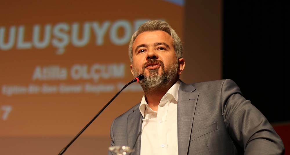 Vesayetçilerin, kalıcı hale getirmek istedikleri ideolojik yapılarını eğitimle temellendirmeye çalıştıklarını kaydeden Olçum, “O nedenle, gerçek kurtuluş, zihni kuşatmaya karşı verilecek mücadeleyle mümkündür. Millî değerlere aidiyeti kimliğimizin esas unsuru sayan bir sendika olarak, vesayetle gerçek mücadelenin eğitimdeki zihni kuşatmanın kırılmasıyla mümkün olacağını savunuyoruz. Şimdi bir yandan, çarpıklığa ayarlı müfredatı millî değerlerimiz, pedagojik gerçekler ve çağın gereklerine uygun hale getirme; diğer yandan, milletin egemen olduğu bir sistemle bu vesayete son vermenin gayreti içindeyiz. Çünkü istikrarlı bir ekonomi, daha adil bir paylaşım düzeni ancak milletin egemen olduğu sistemlerde mümkündür” şeklinde konuştu.