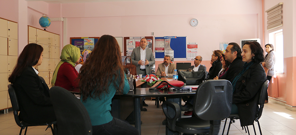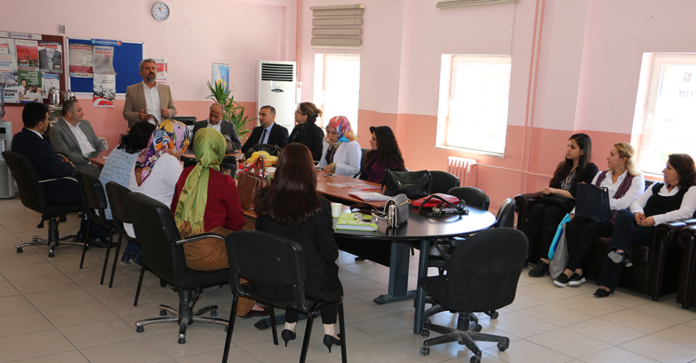 Daha sonra, eğitim çalışanlarıyla bir araya gelen Yayla ve Olçum, sendikal çalışmalar hakkında bilgi vererek, eğitimcilerle bir süre sohbet etti.