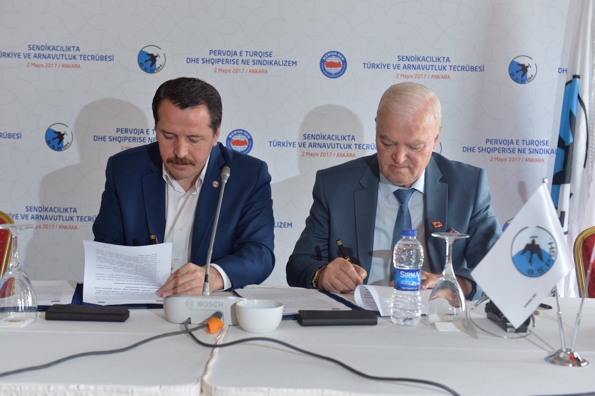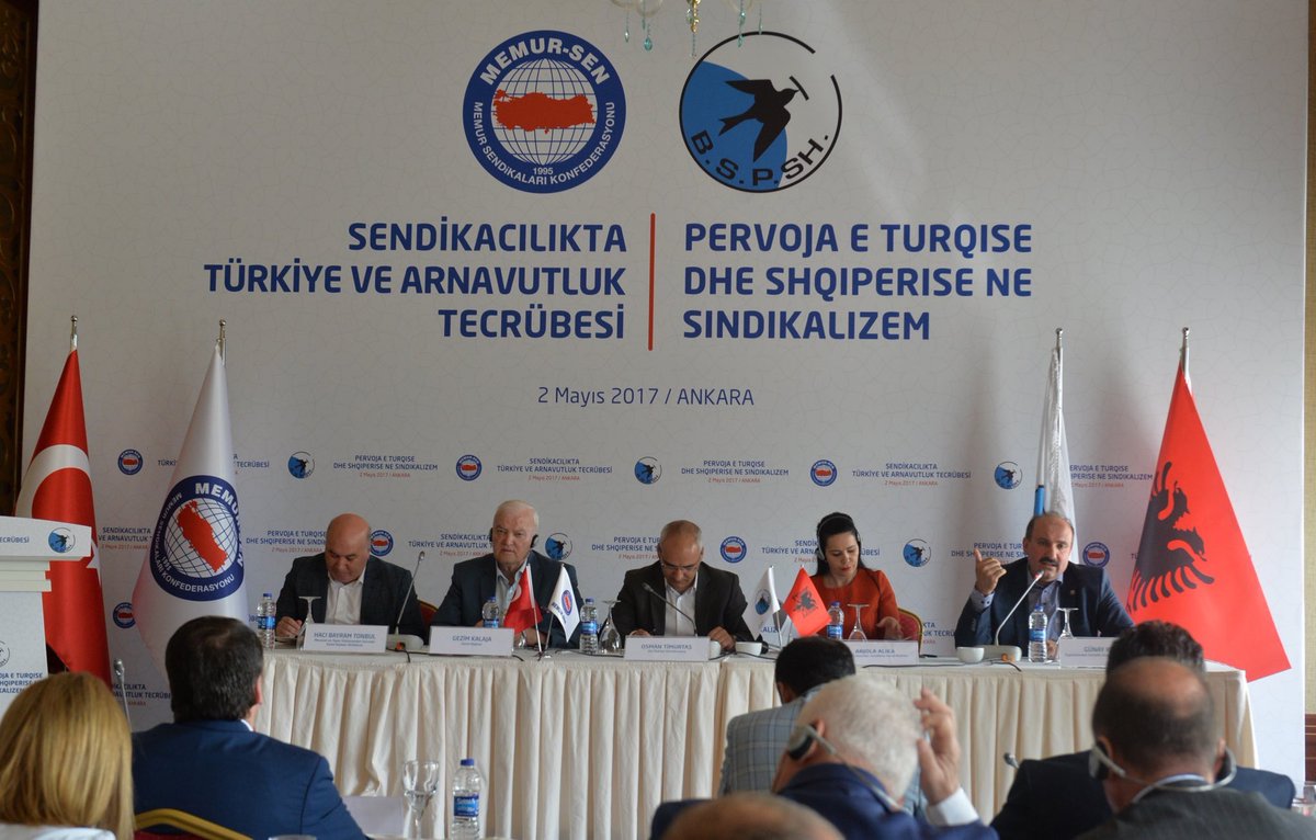 Memur-Sen ve Bağımsız Sendikalar Konfederasyonu’nun (BSPSH) ortak olarak düzenlediği “Sendikacılıkta Türkiye ve Arnavutluk Tecrübesi” programı Ankara’da gerçekleştirildi. Açılış konuşmalarını Eğitim-Bir-Sen ve Memur-Sen Genel Başkanı Ali Yalçın ve BSPSH Genel Başkanı Gezim Kalaja’nın yaptığı program, ikili iş birliği protokolü imzalarıyla devam etti. İki oturumdan oluşan panellerle süren programda, ilk oturumda “Türkiye ve Arnavutluk’ta Sendikal Örgütlenme”, ikinci oturumda ise, “Günümüzde Sendikacılık Hareketlerinin Durumu ve Karşılaştığı Sorunlar” başlıklı konular işlendi.