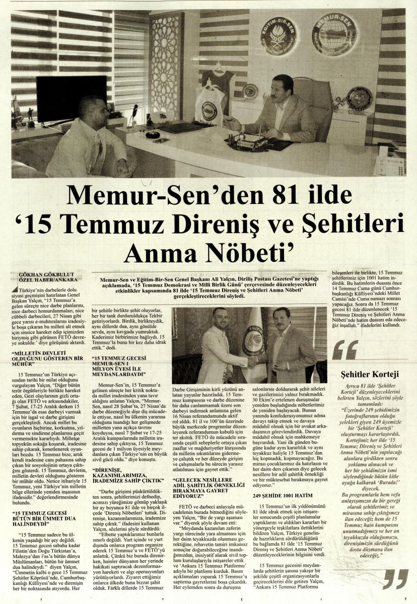Eğitim-Bir-Sen ve Memur-Sen Genel Başkanı Ali Yalçın, Diriliş Postası Gazetesi’ne yaptığı açıklamada, ‘15 Temmuz Demokrasi ve Milli Birlik Günü’ çerçevesinde düzenleyecekleri etkinlikler kapsamında 81 ilde ‘15 Temmuz Direniş ve Şehitleri Anma Nöbeti’ gerçekleştireceklerini söyledi.