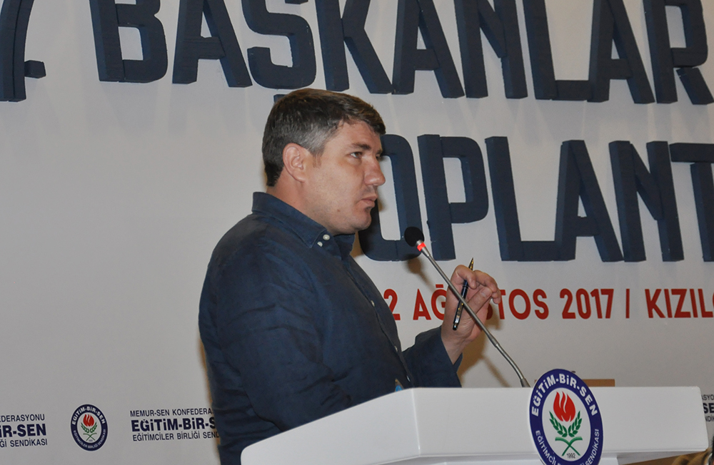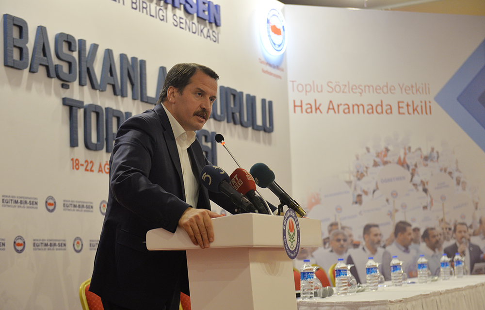 “4. Dönem Toplu Sözleşme sürecinden üçlü rakamlarla, buçuklu rakamlarla uzlaşma çıkması bizim penceremizden imkânsız ötesidir” diye Yalçın, “Dört tane üçün yer aldığı teklif, büyümeyi es geçiyor, enflasyon gerçeğini göz ardı ediyor. Kamu görevlilerinin beklentilerini, bankaların yüksek kâr gerçeğini, alın teri ve emeğin değerini yok sayıyor. Dört tane üçten oluşan teklif, Türkiye’nin ekonomik açıdan 2016 ve 2017 yıllarına göre ileriye değil, geriye gittiği kanaati uyandırıyor. Oysa biz biliyor ve görüyoruz ki, Türkiye’nin potansiyeli arttı. Biz inanıyoruz ki, Türkiye’nin hem bütçesi hem de cüssesi dikkate alındığında, dört tane üçten oluşan teklif, ne adaletle ne cömertlikle ilişkilendirilebilir. Bu teklif, markası cimri, modeli keyfilik olan bir hesap makinesinin ürünüdür. Biz, ‘markası adalet, modeli hakkaniyet’ olan bir hesap makinesinin devreye girmesini bekliyoruz. Toplu sözleşme sürecinin başlamasından kısa bir süne önce KİT’lerle ilgili 2016 ve 2017 yıllarına ilişkin ücretleri belirleyen Yüksek Planlama Kurulu kararı yayımlandı. Bu kararda, KİT Yönetim Kurulu başkanlarının ücretleri yüzde 100 artırıldı, üstelik geçmişe yönelik olarak. Bir başka ifadeyle, yönetim kurulu başkanlarının ücretlerinde geçmişe dönük yüzde 100 artış yapan irade, kamu görevlilerinin gelecek iki yıldaki maaşlarına 3+3 artış teklif ediyor. Geçmişe yüzde 100, geleceğe yüzde 3, yöneticiye yüzde 100, hizmet üreticiye yüzde 3. Böyle bir anlayışı yansıtan teklifi müzakere etmemizi beklemek, Memur-Sen’in geçmişini, davasını ve mücadelesini reddetmeye davet olur. Biz, bu daveti de bu daveti barındıran teklifi de gündemimize almayız. Çünkü soylu mücadelemize, bu mücadeleyi bize emanet edenlere, bu mücadelenin bugünkü müntesiplerine vefa borcumuzu, vekâlet yükümlülüğümüzü beşer perdesinden büyük bir onur görüyoruz. Ne onurumuzu çiğnetiriz ne de kamu görevlilerinin emeğini değersizleştirme sonucu doğuracak bir müzakerenin öznesi olma hatasına düşeriz” ifadelerini kullandı.