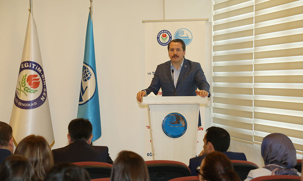 Eğitim-Bir-Sen ve Memur-Sen Genel Başkanı Ali Yalçın, uluslararası eğitim sendikalarıyla iş birliğine ve tecrübe paylaşımına önem verdiklerini ifade ederek, “Eğitim örgütlenmeleri olarak dayanışmamızı, iş birliğimizi, hem gelir adaletinin sağlanması hem alın terimizin karşılığının alınması hem tecrübe paylaşımının yapılarak iyi örneklerin çoğaltılması açısından sürdürmeliyiz. Dünyada huzurun sağlanması için en önemli görevi yapan kitle eğitim kitlesi, bu konuda en fazla sorumluluk alması gereken örgütlü yapılan ise eğitim sendikalarıdır” dedi.
