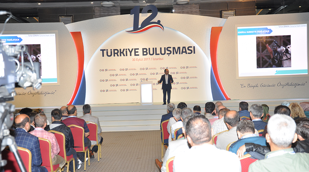 İstanbul’da gerçekleştirilen 12. Türkiye Buluşması’nın açılışında konuşan Ali Yalçın, refaha odaklanırken, mazlum ve mağdurların felahına uzak kalmadıklarını belirterek, şöyle devam etti: “Eğitim-Bir-Sen’in farkı, dayatılan verili sendikal anlayışı ve sınırları reddedip, medeniyet değerlerimizden beslenen, milletin iradesine değer veren, milletle birlikte yürüyen, özgün ve özgür bir sendikacılığı bu topraklarla tanıştırmasıdır. Bizim sendikacılığımız hem kitabın gereklerine hem de hayatın gerçeklerine yaslanıyor. Sendika bizim için, yeryüzünün imarı ve ıslahı, hayrın inşası, hakkın ve hakikatin aynası, insanlığın felahı için bir araç oldu. Bu nedenle refaha odaklanırken, mazlum ve mağdurların felahına uzak kalmadık. Bordrolardaki rakamlara, emeklilik haklarına, çalışma şartlarına, mali, sosyal ve özlük haklarına yönelirken; dünyayı sömürenleri, insanlığa zulmedenleri görmezden gelmedik. İstediğimiz zam kadar, mazlumları yıkan gam da gündemimizde yer buldu. Maaş artışını dile getirirken, eğitim sistemindeki sıkıntılara lal kesilmedik. Nöbet ücreti mağduriyetini göz önüne sererken, kıyıya vuran Aylan bebeklere kör bakmadık. Ders ücretini artırmak için ter akıtırken, Mısır’a, Arakan’a, Kudüs’e sırtımızı dönmedik. Özlük hakları için koştururken, müfredat ve ders kitapları söz konusu olunca durmadık. Ücrete odaklanıp zulmete göz yummadık.”