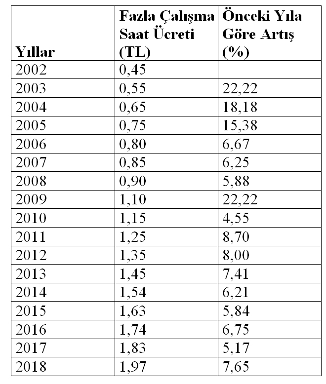 Bu çerçevede 2002 ila 2017 yıları bütçe kanunlarına ekli söz konusu cetvellerde belirlenmiş ve uygulanmış olan saat başı fazla mesai ücreti tutarları ile yıllık artış oranları incelendiğinde bu durum çok açık bir şekilde ortaya çıkmaktadır.