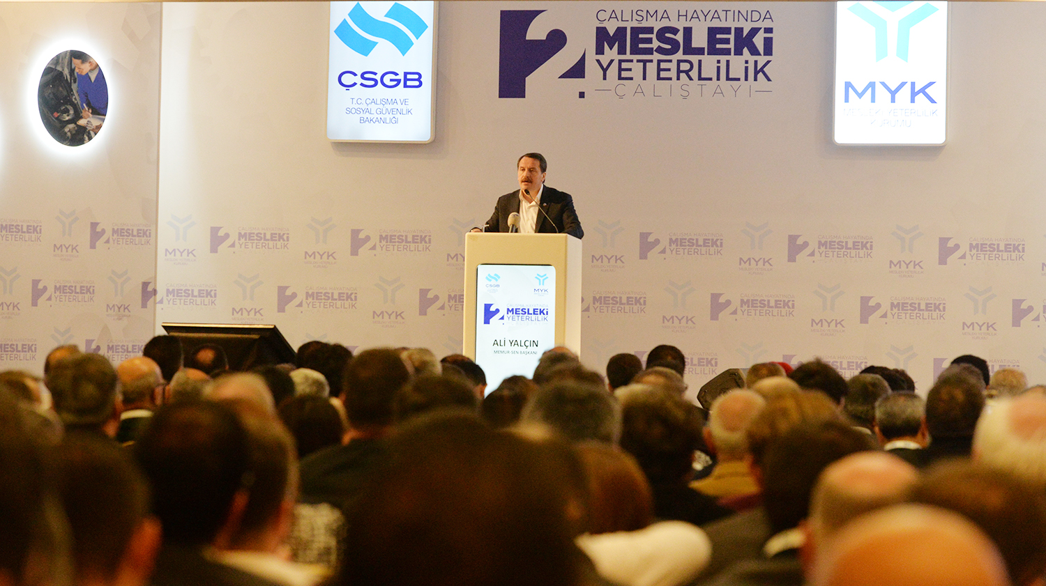 Çalışma ve Sosyal Güvenlik Bakanlığı tarafından ikincisi düzenlenen Mesleki Yeterlilik Çalıştayı Ankara’da yoğun bir katılımla gerçekleştirildi. Çalışma ve Sosyal Güvenlik Bakan Yardımcısı Orhan Yeğin, eski Başbakan Yardımcısı Emrullah İşler, Çorum Milletvekili Salim Uslu, Hak-İş Genel Başkanı Mahmut Arslan, TESK Genel Başkanı Bendevi Palandöken, Mesleki Yeterlilik Kurumu Başkanı Adem Ceylan, İŞKUR Genel Müdürü Cafer Uzunkaya, TOBB Başkan Vekili Faik Yavuz ve çok sayıda davetlinin katıldığı çalıştayın açılışında konuşan Eğitim-Bir-Sen ve Memur-Sen Genel Başkanı Ali Yalçın, ülkemiz açısından mesleki yeterliliğin tarihini kavramsal açıdan 90’lardan, kurumsal olarak da 2000’li yılların ikinci yarısından itibaren başlatmayı doğru bulmadığını ifade ederek, gerek inanç-medeniyet ilişkisi bağlamında gerekse kurumsal yapılanma ve toplumsal karşılık olarak mesleki yeterliliğin çok eski tarihsel içeriğe sahip olduğunu söyledi.