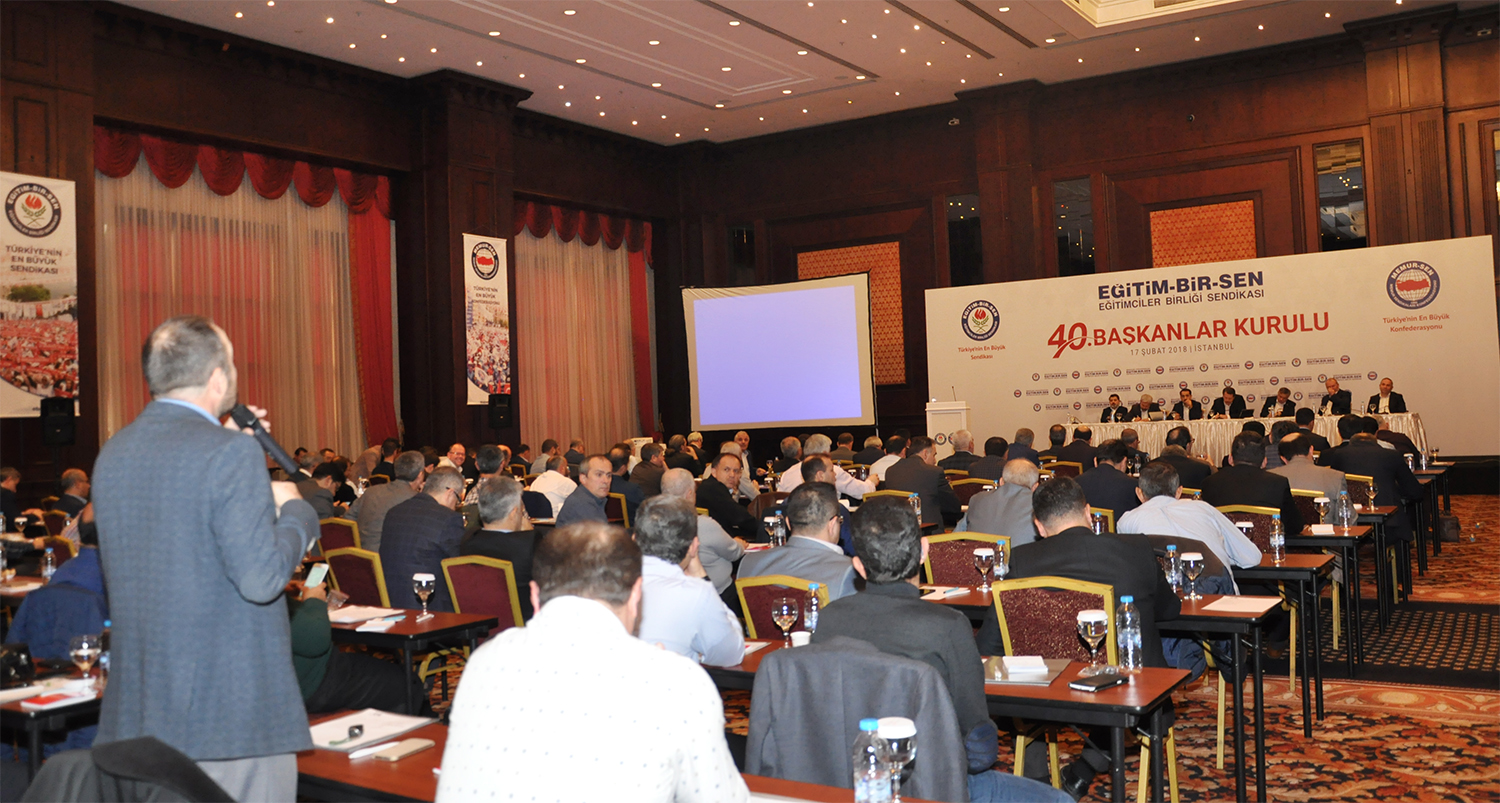 Eğitim-Bir-Sen 40. Başkanlar Kurulu toplantısı İstanbul’da gerçekleştirildi. Sendikal çalışmaların değerlendirildiği, gündeme ilişkin istişarelerin edildiği toplantının açılışında konuşan Ali Yalçın, aklın hakkını vermekle, akılla yol yürümekle, akılla iş görmekle yetinmeyen, üstüne ilkelerinden taviz vermeden, değerlerinden vazgeçmeden hem işi doğru yapmanın hem de doğru işler yapmanın derdini yüklenen Eğitim-Bir-Sen’in 26 yıllık soylu mücadelesinin yerelden evrensele, zirveden yeni ufuklara yolculuğuna öncülük eden başta Mehmet Akif İnan ve yol arkadaşları olmak üzere, kuruluştan bugüne emek verenlere, fedakârlıklarıyla davaya hizmet edenlere teşekkür etti.