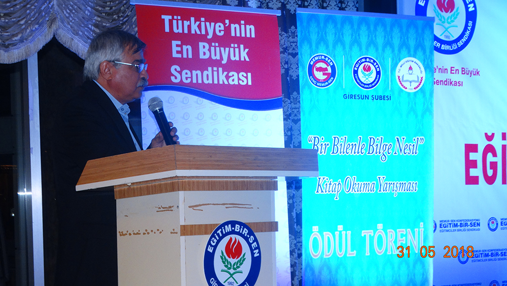 Eğitim-Bir-Sen Giresun Şube Başkanı Mustafa Öz ise, üyelerle buluşma, kaynaşma etkinlikleri kapsamında bu yıl da iftar yemeğinde bir araya geldiklerini dile getirerek, “Bu yılın bir başka özelliği ise, gençlerin kitap okuma, okuduğunu anlama ve anladığını anlatma projesi kapsamında Milli Eğitim Bakanlığı ile ortaklaşa düzenlediğimiz kitap okuma yarışmasıdır. Çok sayıda öğrencinin katıldığı yarışmada dereceye giren 40 öğrenciye çeşitli hediyeler verdik” şeklinde konuştu.