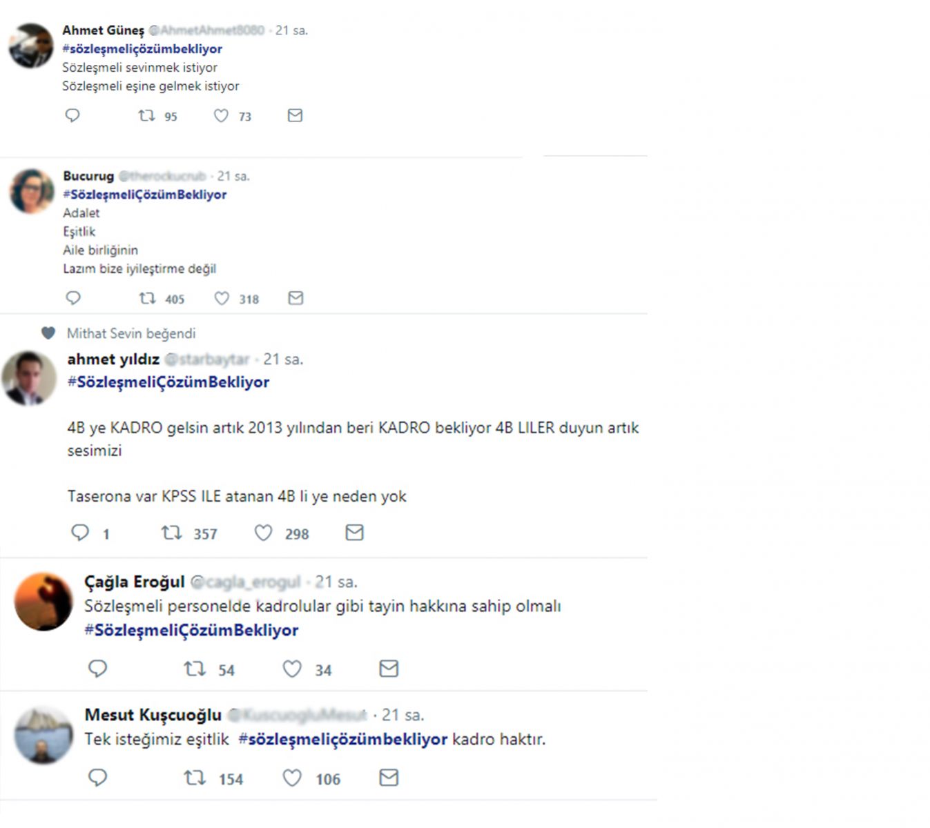 Yüz binlerce twitin atıldığı çalışmada öncelikli talepler arasında sözleşmelilerin kadroya geçirilmesi, iş güvencesinin sağlanması ve tayin hakkının verilmesi yer aldı. Sözleşmeli memurların kısa sürede Türkiye gündeminin üst sıralarına taşıdığı #SözleşmeliÇözümBekliyor başlığı altında birçok talep dile getirildi.