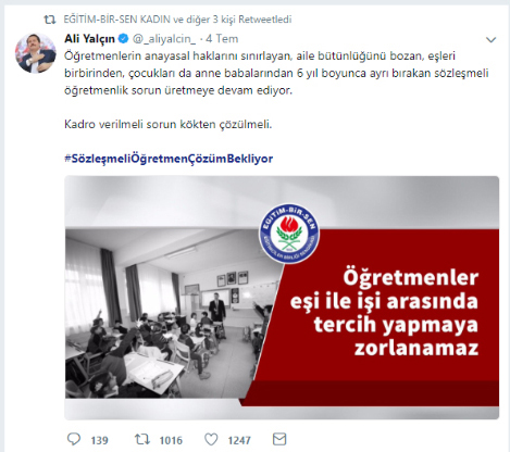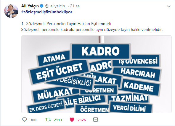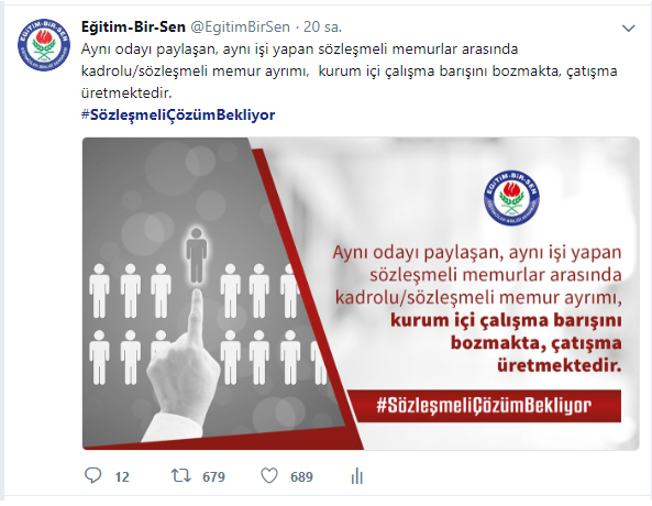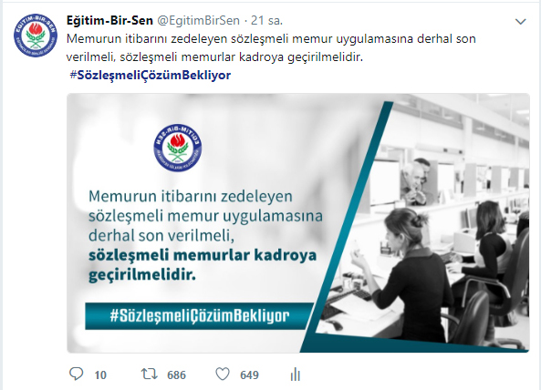 Toplumun her kesiminden destek alan çalışmamız sözleşmeli istihdamının uzun vadede birçok soruna gebe olduğunu, gözetilemez süreçlere kapı aralayacağını gösterdi. Yüz binlerce twitin atıldığı bu sorunlara yetkililerin duyarsız kalmamasını, sorunun çözümü için en kısa sürede gerekli adımların atılmasını temenni ediyoruz.