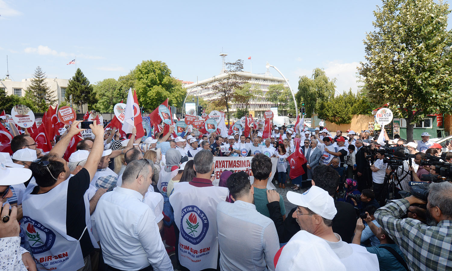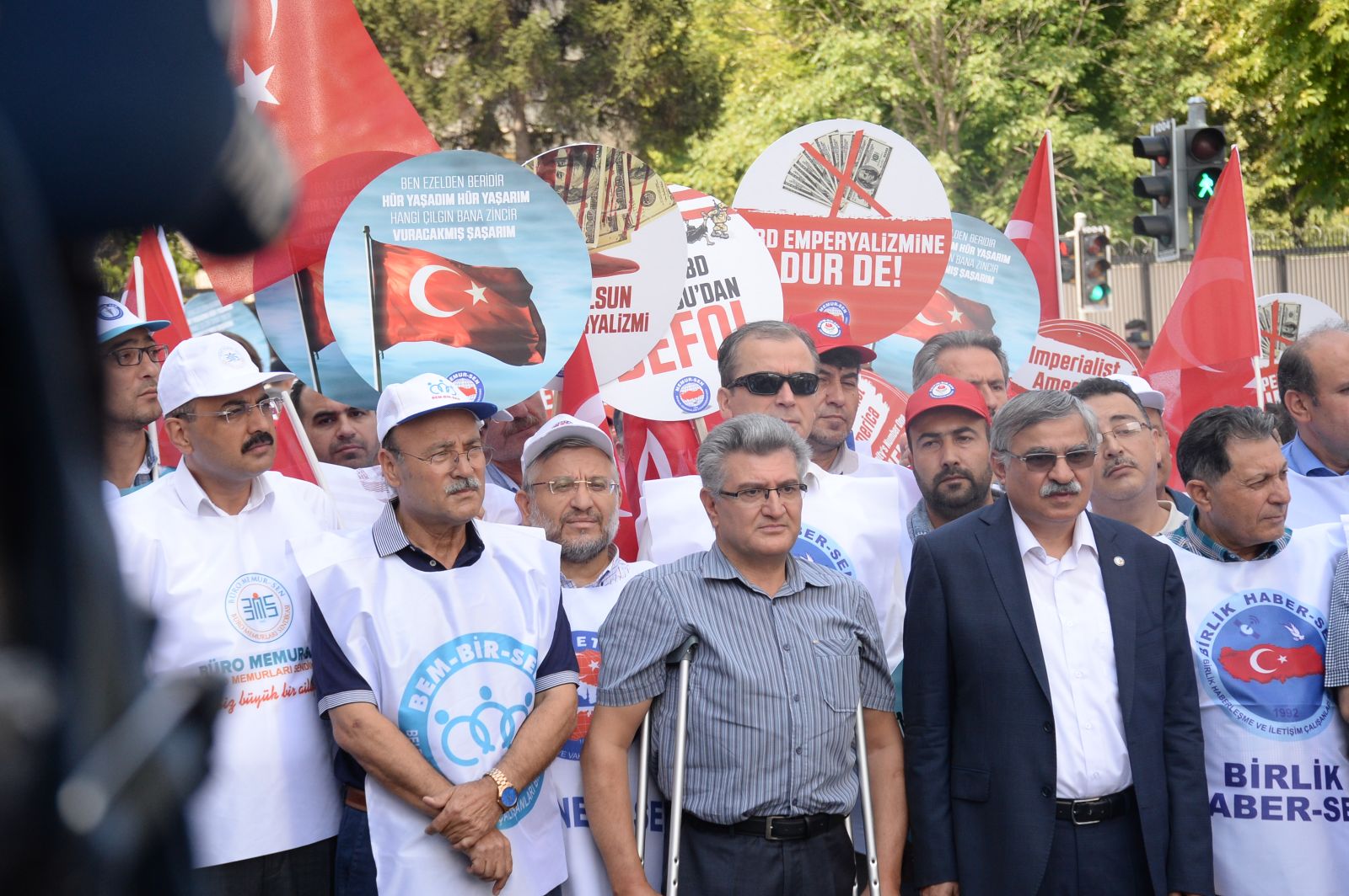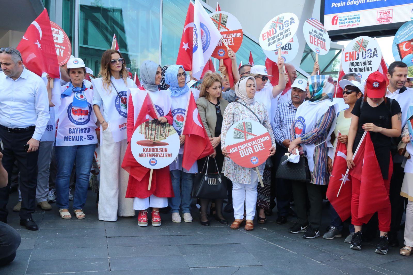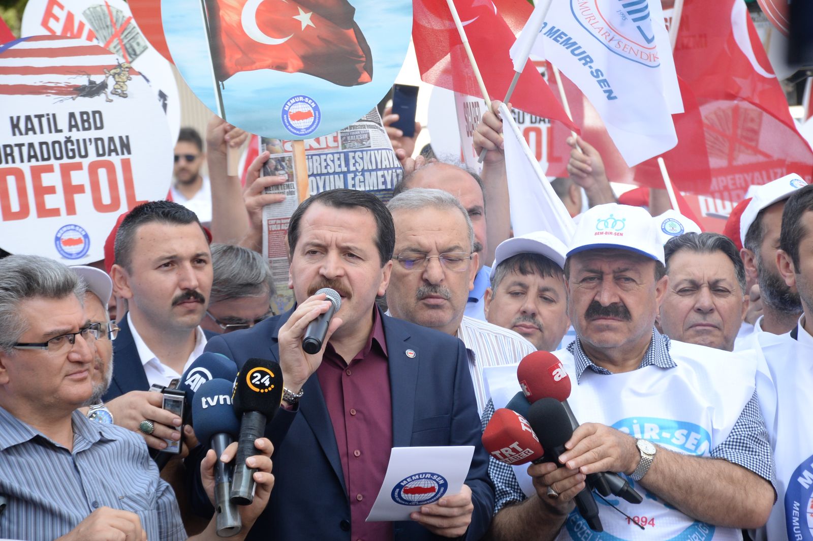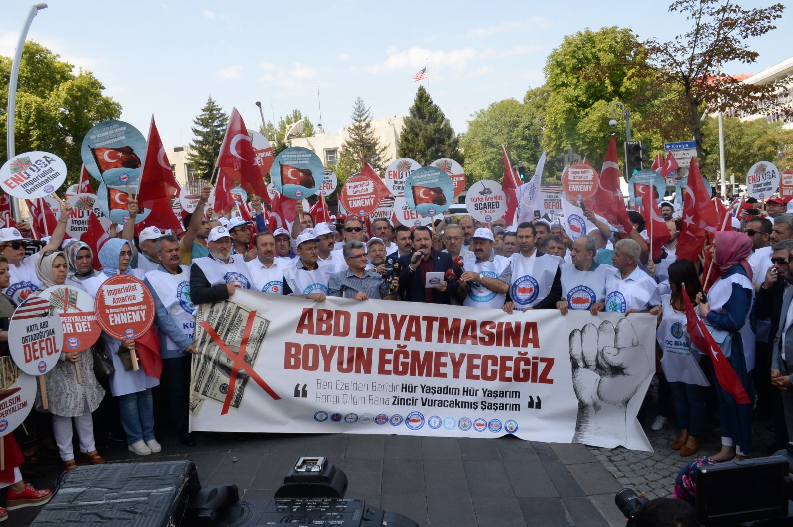 Memur-Sen, Amerika Birleşik Devletleri’nin Türkiye’ye karşı hukuksuz yaptırımını ABD Büyükelçiliği önünde protesto etti. Memur-Sen ve bağlı sendikaların yönetimleri, üyeler ve çok sayıda vatandaşın katıldığı eylemde, “Kahrolsun ABD emperyalizmi”, “Emperyalist devlet yıkılacak elbet”, “ABD terörden desteğini çek” sloganları atılarak, ABD’nin yaptırım kararı telin edildi.