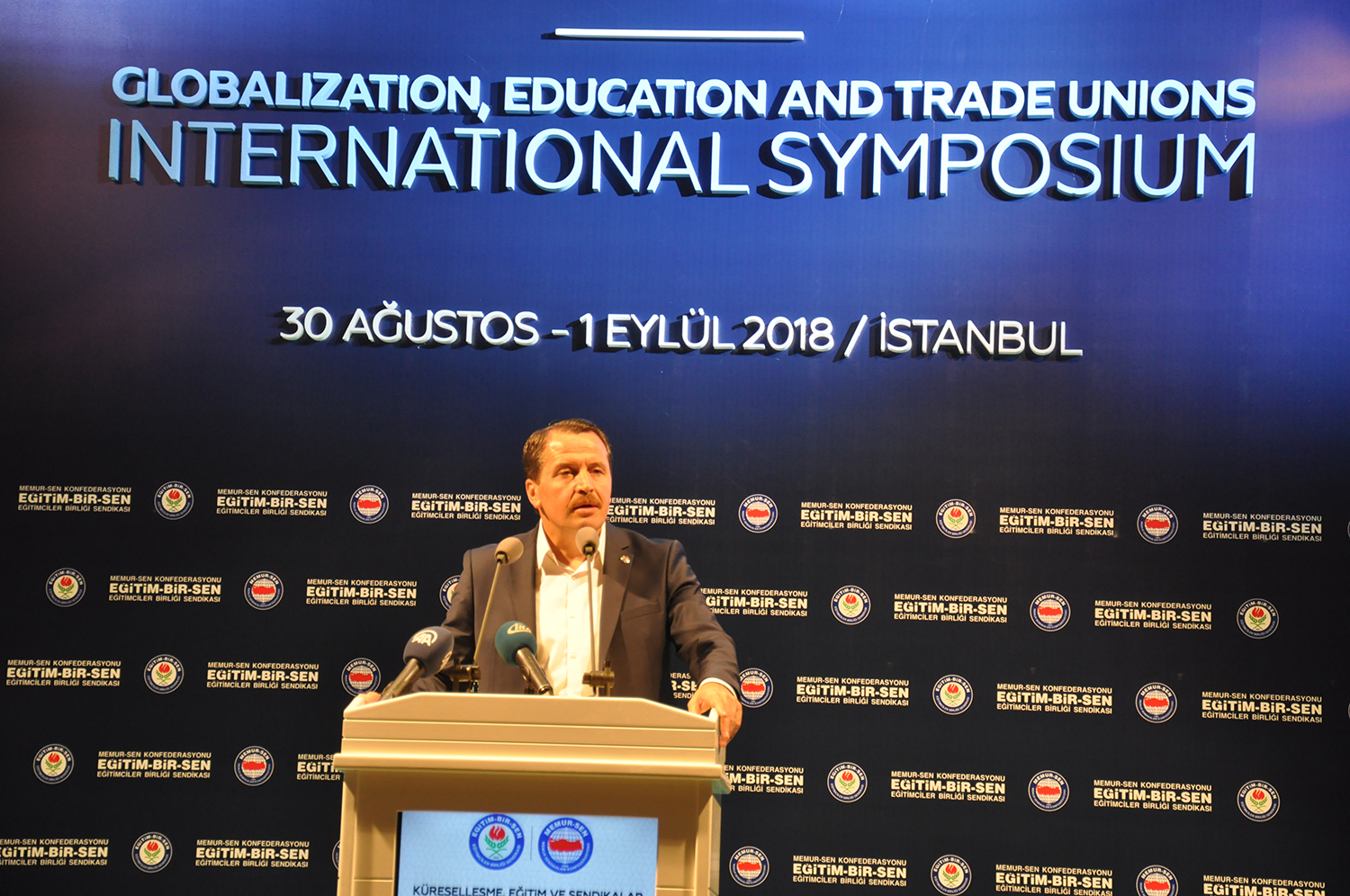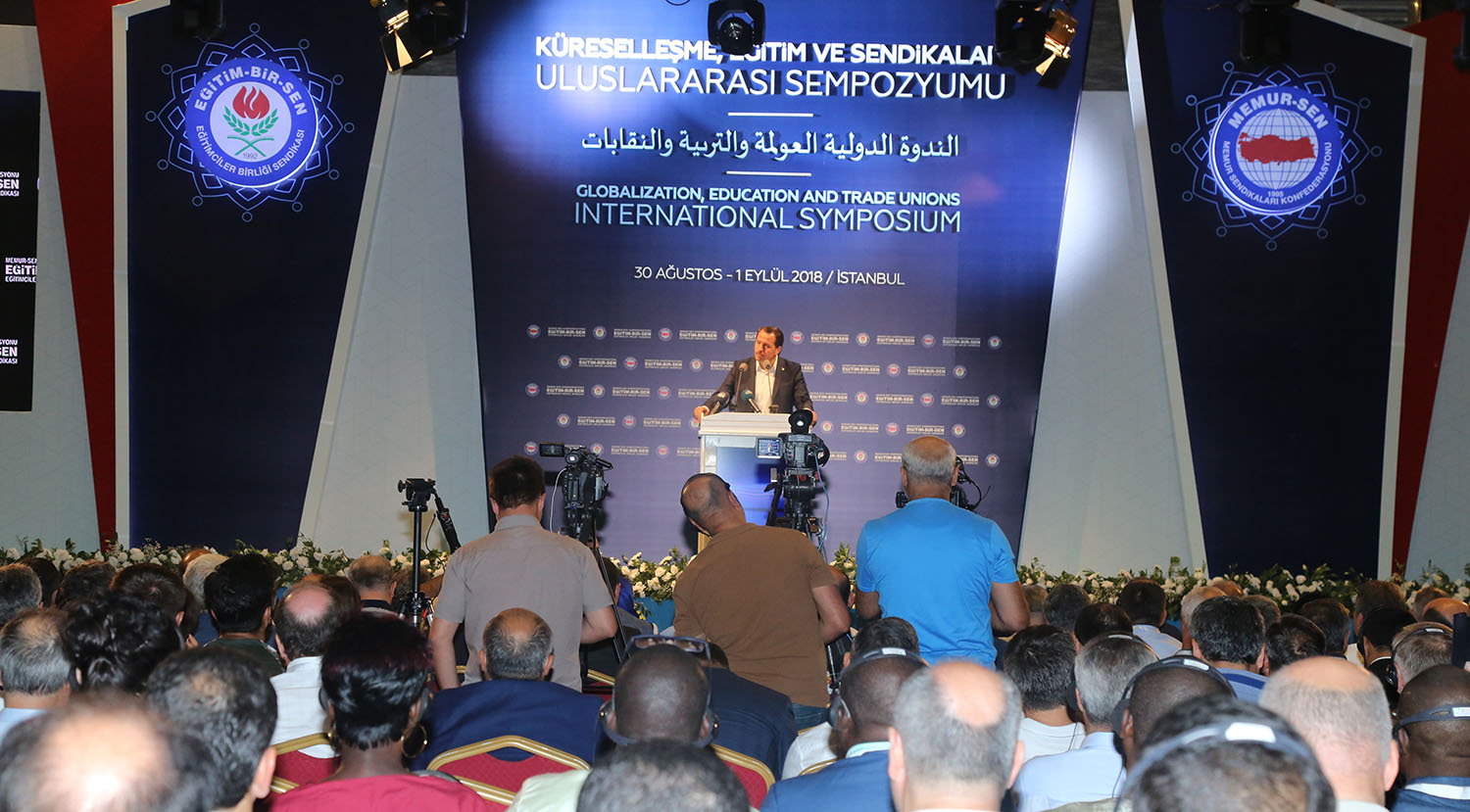 Uluslararası “Küreselleşme, Eğitim ve Sendikalar” sempozyumu, Millî Eğitim Bakan Yardımcısı Prof. Dr. Mustafa Safran, Kahramanmaraş Milletvekili Habibe Öçal, Türkiye Maarif Vakfı Başkanı Prof. Dr. Birol Akgün, MEB Hayat Boyu Öğrenme Genel Müdürü Mehmet Nezir Gül, Personel Genel Müdürü Hamza Aydoğdu, Teftiş Kurulu Başkanı Atif Ala, 77 ülkeden 89 sendika ve 4 uluslararası örgütten 175 yönetici, Eğitim-Bir-Sen Şube başkanları, Kadınlar Komisyonu üyeleri ve genç sendikacıların katılımıyla İstanbul’da başladı.