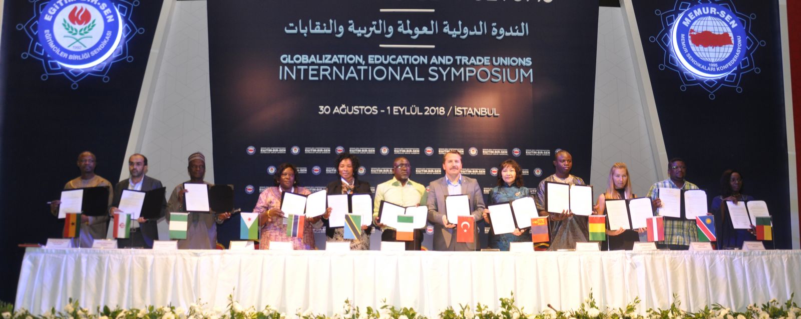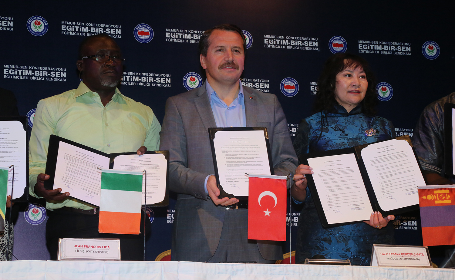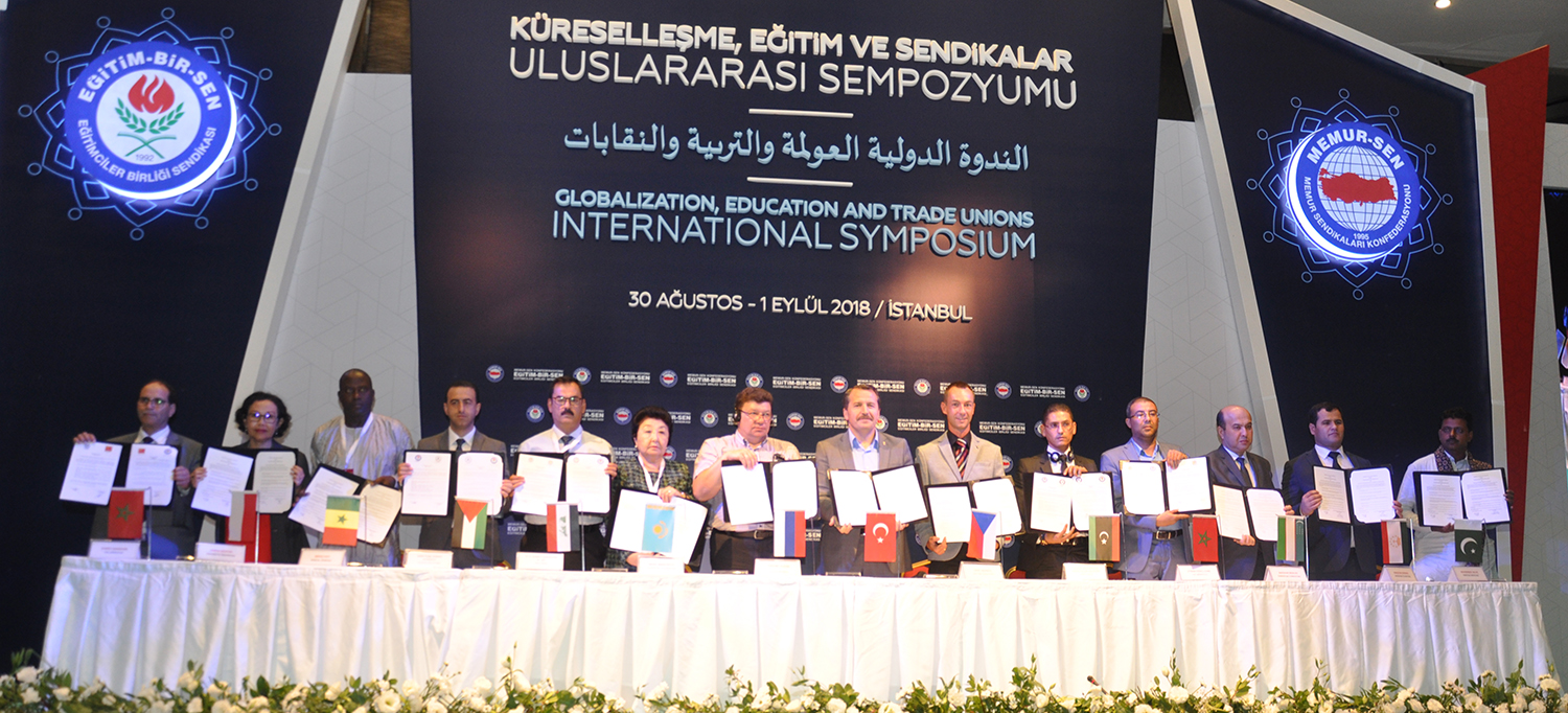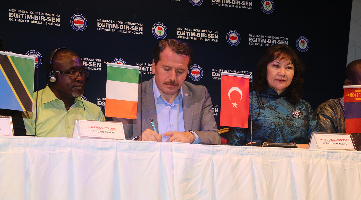 Konuşmanın ardından, sempozyuma katılan Benin Ulusal Eğitim Sendikası SNEP, Cibuti Ortaokul ve Lise Öğretmenleri Sendikası SYNESED, Çek Cumhuriyeti Eğitim Çalışanları Sendikası CMOS PS, Endonezya Eğitimciler Sendikası PGRI, Fildişi Sahili Ortaokul Öğretmenleri Sendikası SYLEG, Gambiya Öğretmenler Birliği, Gana Eğitim ve Öğretim Çalışanları Sendikası TEWU, Gine Profesyonel Eğitim Sendikaları Federasyonu FSPE, İran İşçiler Birliği, Kazakistan Eğitim ve Bilim Çalışanları Sendikası KTUESW, Letonya Eğitim ve Bilim Çalışanları Sendikası LIZDA, Moğolistan Eğitim ve Bilim Çalışanları Sendikası TUESWM, Namibya Öğretmenler Sendikası TUN, Nijerya Eğitim Sendikası NUT, Özbekistan Eğitim, Bilim ve Kültür Çalışanları Sendikası NTUESCWU, Pakistan Eğitim Çalışanları Birliği TEWU, Rusya Eğitim ve Bilim Çalışanları Sendikası ESEUR, Senegal Özgür Eğitimciler Birliği SELS-A, Tacikistan Eğitim ve Bilim Sendikası TUESRT, Tanzanya Eğitimciler Sendikası TTU, Libya Trablus Öğretmenler Sendikası, Fas Demokratik Eğitim Örgütü, Fas Özgür Eğitim Sendikası, Filistin Genel Öğretmenler Birliği, Kuzey Irak Öğretmenler Birliği ile eğitim ve iş birliği anlaşması imzalandı.