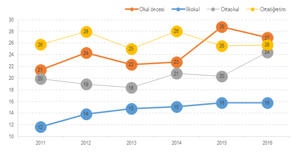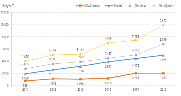 2016 yılında Türkiye’deki eğitim harcamaları içinde okul öncesi için yapılan harcamaların yüzde 27’si hanehalkları tarafından yapıldı. İlkokul için yapılan eğitim harcamalarının yüzde 16’sını, ortaokul için yapılan eğitim harcamalarının yüzde 24’ünü ve ortaöğretim için yapılan eğitim harcamalarının yüzde 26’sını hanehalkları yaptı.