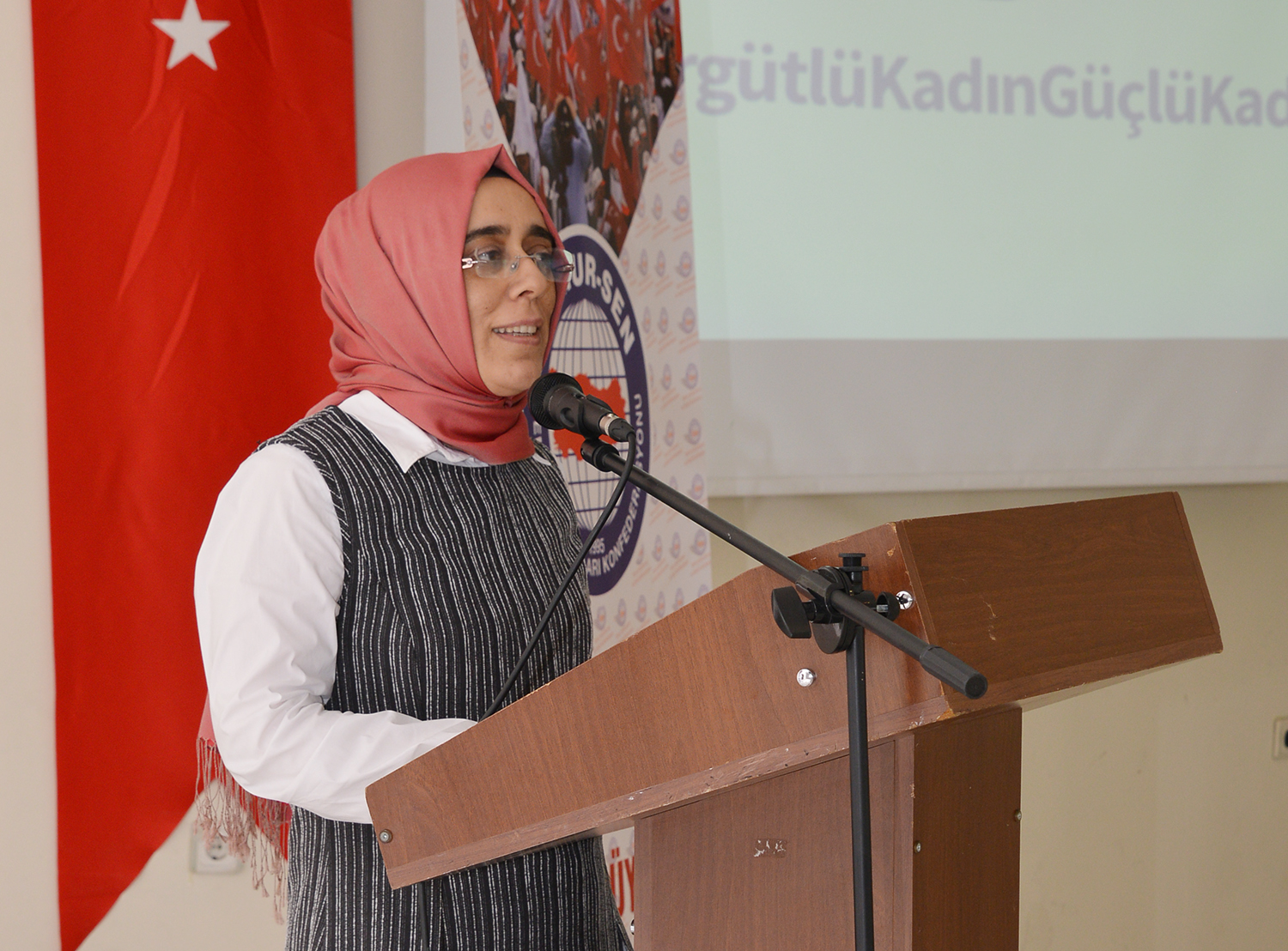 Eğitim-Bir-Sen Kadınlar Komisyonu Başkanı Melek Altunel, ‘Bana ne’ demeden, konformizmin tuzağına düşmeden çalışmalarına kararlılıkla devam edeceklerini belirterek, “Bizler zorluğa talip olan insanlarız. Bu zorlu yolculukta en büyük gücümüz, örgütlülüğümüzdür. Sorunların çözümü de kazanımların yolu da güçlerimizi birleştirmekten, dayanışmaktan, el ele vermekten, omuz omuza yürümekten geçmektedir. Derdi, davası olan eğitimci kadınlarla omuz omuza, gece gündüz demeden ter akıtacak, sorunlarımızı kendi medeniyet kodlarımızı baz alarak çözmeye çalışacağız” dedi.