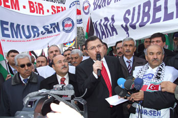 Burada bir konusma yapan Memur-Sen ve Egitim-Bir-Sen Genel Baskani Ahmet Gündogdu, Israil’in vahsetiyle bas basa birakilan Gazze’nin izolasyonunu protesto için 6 Aralik’ta Londra’dan yola çikan “Filistin’e Yol Açik” konvoyuna Misir Hükümeti’nin insanlik disi muamelelerde bulunmasini kinadi. Ingiltere’nin, konvoyun kendi ülkesinden geçisine izin verdigini ifade eden Gündogdu, “Müslüman bir ülke olan Misir’in insani amaçlarla Gazze’ye ulasmak isteyen konvoyu engellemesini anlamakta güçlük çekiyoruz” dedi.