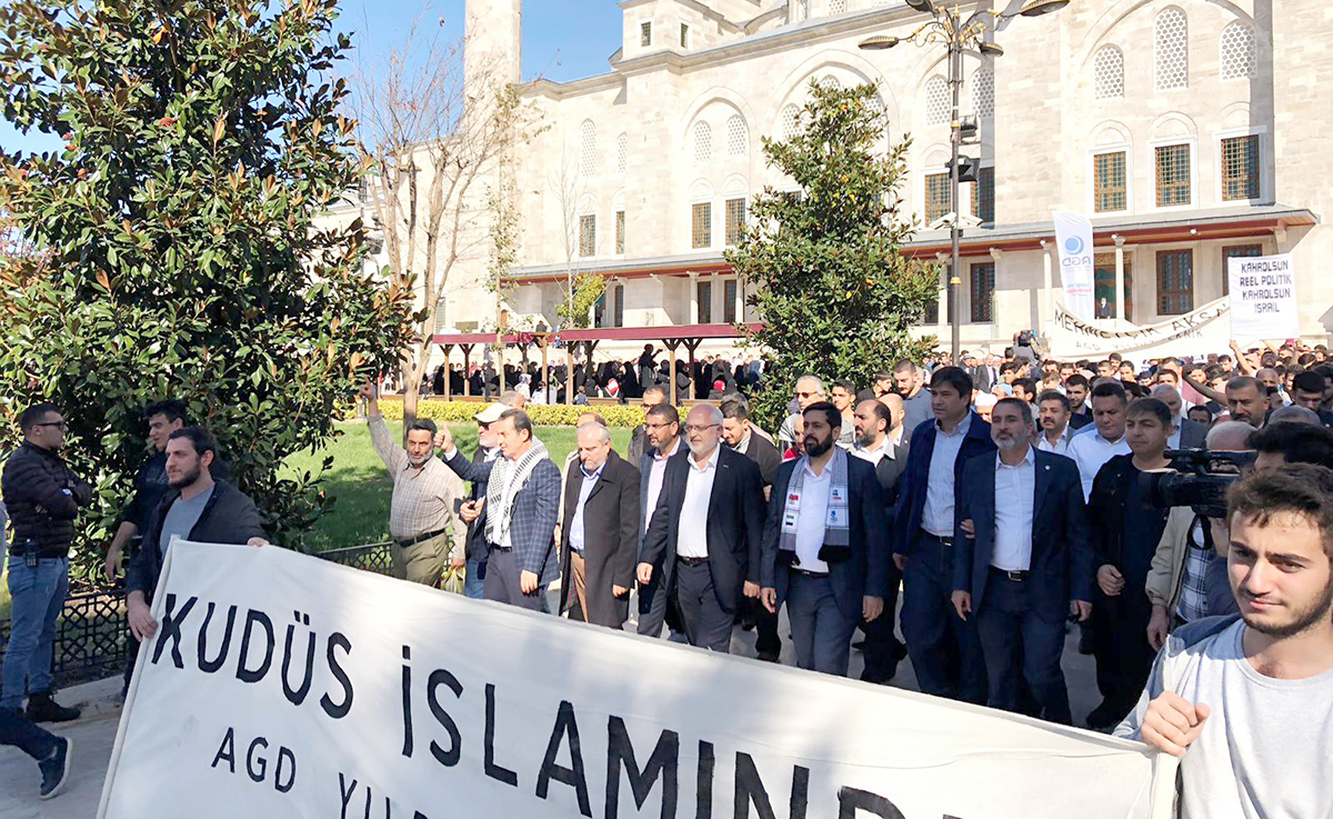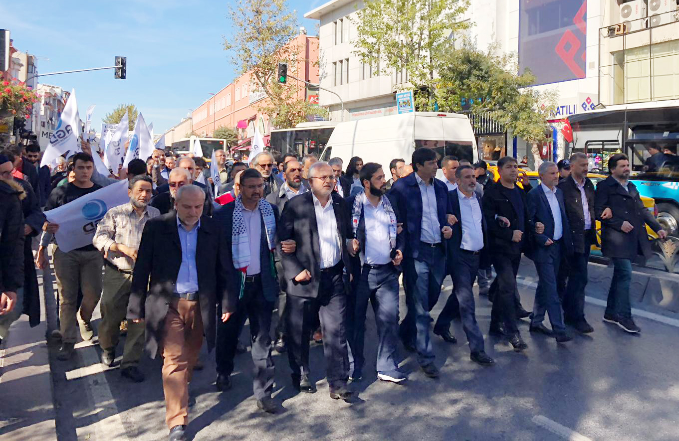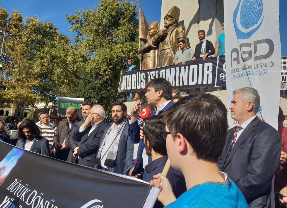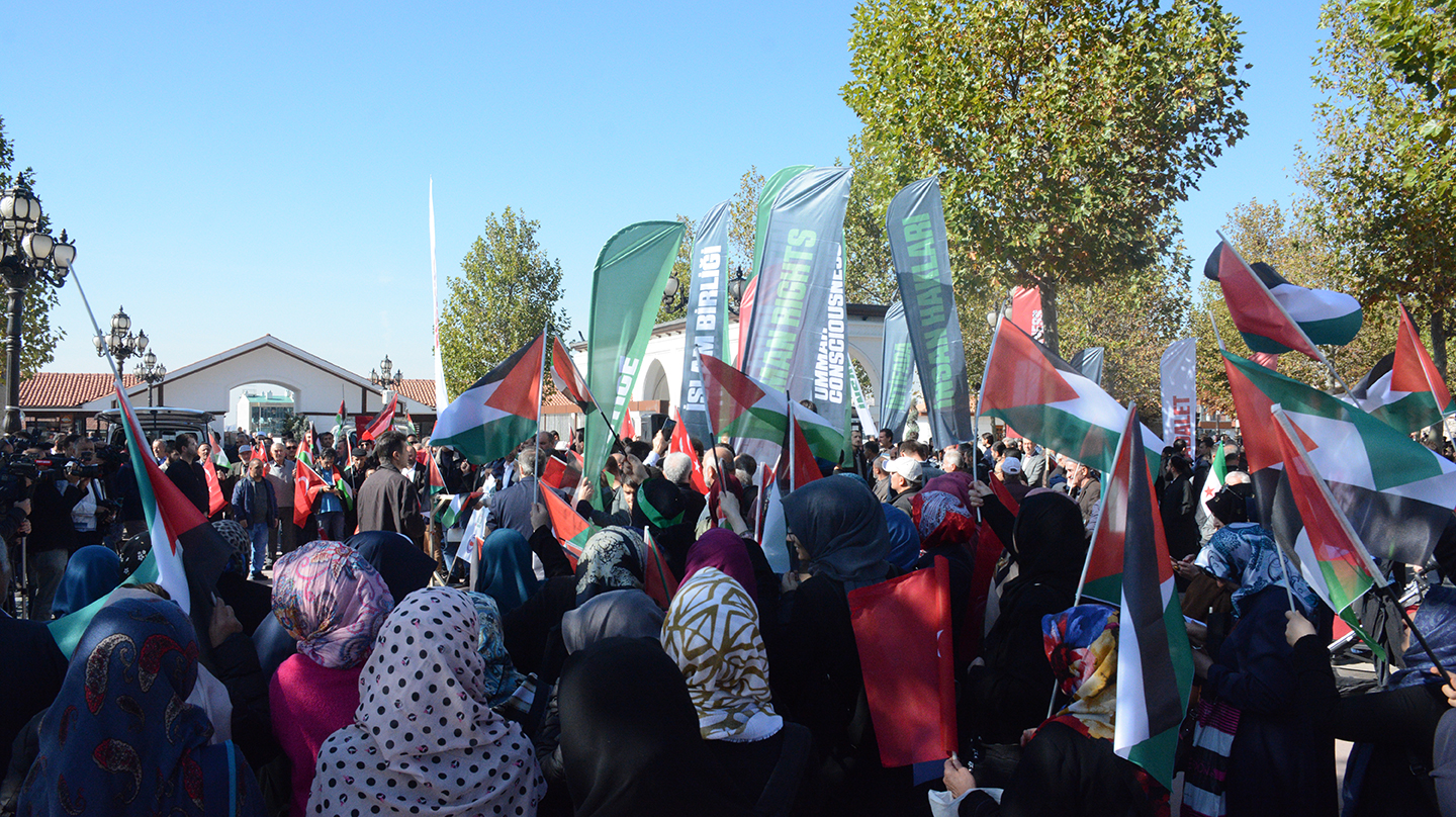 Karşımızda Mescid-i Aksa’yı yıkıp yerine Süleyman Mabedini yapmayı planlayan bir akıl var. Süleyman Mabedi yapıldığında yeryüzüne Mesih’in geleceğine ve Davut Peygamberin tahtına oturacağına inanan bir akıl var. Siyonizm her yönüyle sapkın bir ideolojidir ve Siyonist İsrail’e karşı Filistin halkının yanında olmak aslında tüm insan neslinin yanında olmaktır. Karşımızda, kan dökmekten haz alan, kadın ve çocuk öldürmekten haz alan, aşağılık bir zihniyet var. Karşımızda meskenleri, mabetleri, okulları ve sağlık merkezlerini vurmaktan imtina etmeyen bir zihniyet var. Kendisinden başkasına hayat hakkı tanımayan, başkalarının kutsalına tahammül edemeyen bir zihniyet var. Ekini bozan, nesli ifsat eden akıl Siyonist akıldır. Tüm Müslümanların ve tüm insanlığın Siyonist projeye kenetlenmesi gerekir. Bugün Büyük Dönüş Yürüyüşü’ne destek olmak, Filistin halkının ve haklı Filistin davasının yanında olduğumuzu göstermek için burada toplandık. Uluslararası toplumdan, içeride ve dışarıda vicdan sahibi siyasi tüm aktörlerden beklentilerimiz şunlardır: