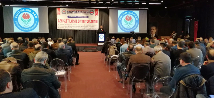 Mithat Sevin, Samsun 1 ve 2 No’lu şubelerin il divan toplantısına katıldı. Burada bir konuşma yapan Sevin, insanı, insan onurunu, emeği, alın terini, hakkı, hukuku, özgürlükleri ve hakkı çiğnenen tüm mağdur ve mazlumları merkeze alarak sendikacılık yaptıklarını ifade ederek, “Zor zamanda atılan doğru bir adım, yürünmesi gereken uzun bir menzilin başlangıcı, varılması gereken geniş bir ufkun da habercisidir. Toplumsal hayatın akışkanlığı, alışkanlığını değiştirebilen iradenin elinde ancak yeni bir yöneliş, geleceğe doğru bir silkiniştir. Bu idealle 1992’de birlerle başlayıp bu cihette süren sendikal yolculuğumuzda 27. yılımızı tamamlıyoruz. Eğitim-Bir-Sen’i bugünlere taşıyan, bu sorumluluğun ağırlığına yakışır bir vakarla çalışan fedakâr ve vefakâr teşkilatımıza teşekkür ediyorum” şeklinde konuştu.