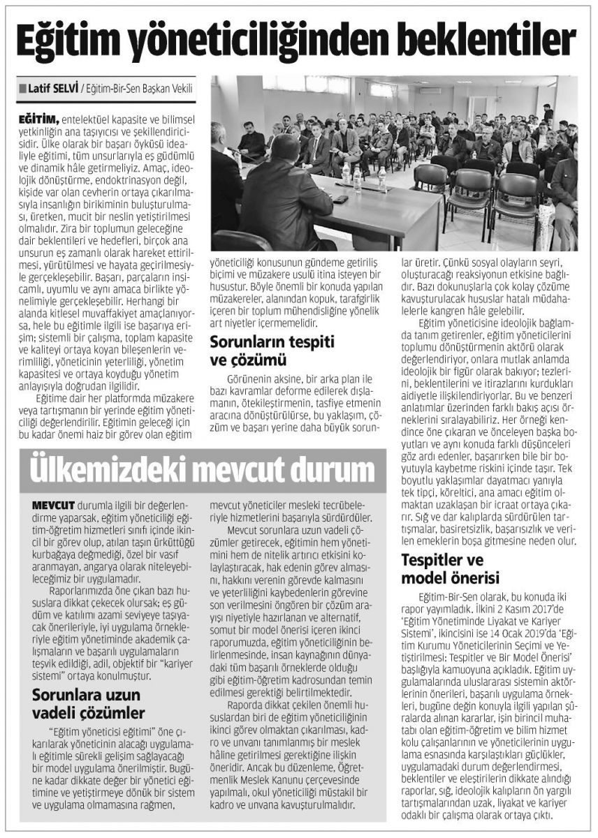 Eğitim-Bir-Sen olarak, bu konuda iki rapor yayımladık. İlkini 2 Kasım 2017’de ‘Eğitim Yönetiminde Liyakat ve Kariyer Sistemi’, ikincisini ise 14 Ocak 2019’da ‘Eğitim Kurumu Yöneticilerinin Seçimi ve Yetiştirilmesi: Tespitler ve Bir Model Önerisi’ başlığıyla kamuoyuna açıkladık. Eğitim uygulamalarında uluslararası sistemin aktörlerinin önerileri, başarılı uygulama örnekleri, bugüne değin konuyla ilgili yapılan şûralarda alınan kararlar, işin birincil muhatabı olan eğitim-öğretim ve bilim hizmet kolu çalışanlarının ve yöneticilerinin uygulama esnasında karşılaştıkları güçlükler, uygulamadaki durum değerlendirmesi, beklentiler ve eleştirilerin dikkate alındığı raporlar, sığ, ideolojik kalıpların ön yargılı tartışmalarından uzak, liyakat ve kariyer odaklı bir çalışma olarak ortaya çıktı. Umarım bu raporlar, eğitim yönetimini tasfiye ve kavganın merkezine taşımak isteyenlerin sorunlu yaklaşımlarına kurban edilmez.