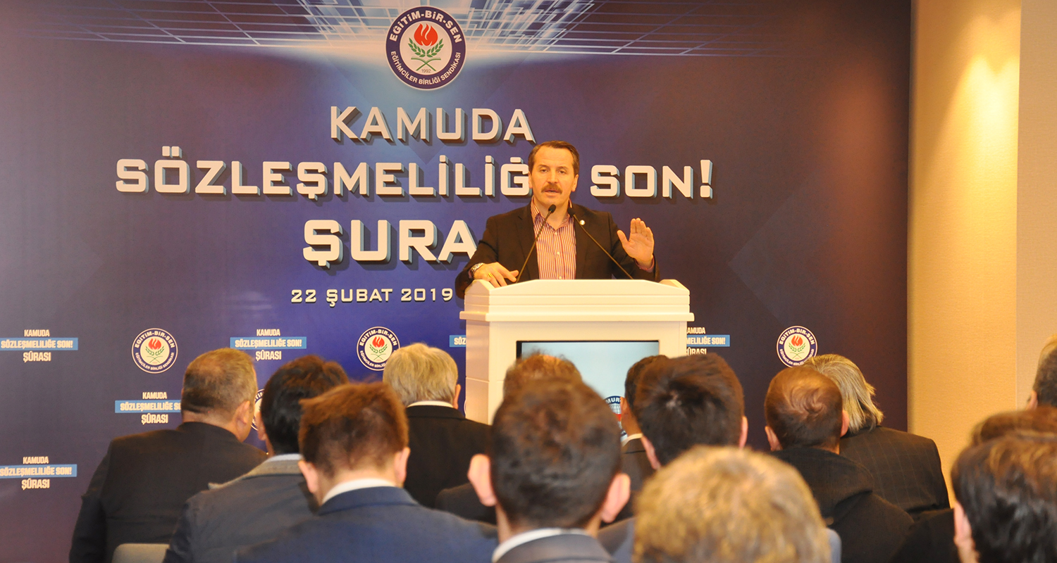 “Kamuda Sözleşmeliliğe Son” şûrası kapsamında hizmet kolları çalıştayı yapıldı. Eğitim, Öğretim ve Bilim Hizmet Kolu’nda görev yapan sözleşmeli personelin katılımıyla Memur-Sen Genel Merkezi’nde düzenlenen çalıştayın açılışında konuşan Eğitim-Bir-Sen ve Memur-Sen Genel Başkanı Ali Yalçın, sözleşmeli istihdamı bütün yönleriyle masaya yatıracaklarını söyledi.