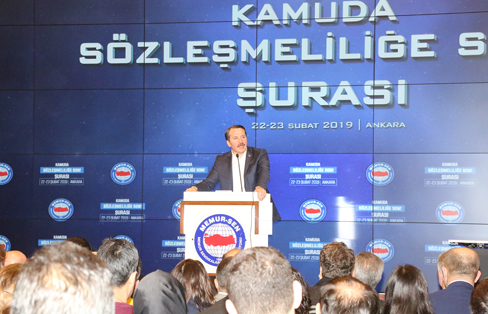 “Daha kestirme bir söyleyişle, sözleşmeli personel rejimi, hem mevzuatıyla hem de varlığıyla bir sorunlar ve tepkiler yumağı oluşturmaktadır. Saygın iş ilkesine, adalet eşiğine, insan onurunu koruma hassasiyetine, insanın kendini gerçekleştirmesine destek vermekle görevli devlet perspektifine aykırı sözleşmelilik uygulamasının mağduriyetlerini azaltmalı, sonra da bütünüyle varlığını ortadan kaldırmalıyız. Biz, sözleşmelilikte 4+2’ye de 3+1’e de karşıyız. Atamaların kadrolu yapılmasını istiyoruz. Türkiye, kamu hizmetlerini bütünüyle kadrolu personel ile verebilecek kadar kadim bir birikime, bunun finansla maliyetini karşılayacak ekonomik yeterliliğe sahiptir. Hiç kimse aksine inanmamızı istemesin. Çalıştaylarımız ve şûramız bunun hem mümkün hem de gerekli olduğunu tescilleyen bir iradeyi ve birikimi ortaya koyacaktır.”