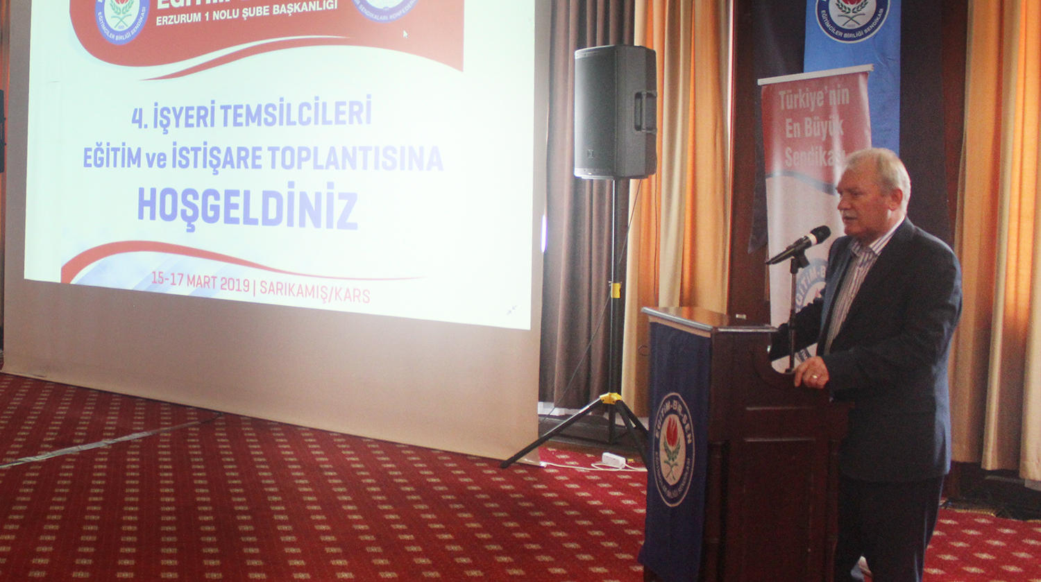 Erzurum 1 No’lu Şube’nin düzenlediği işyeri temsilcileri eğitim ve istişare toplantısında konuşan Mithat Sevin, 27 yıllık sendikal tarihlerinde, eğitim, öğretim ve bilim hizmet kolunda görevli tüm eğitim çalışanlarının sorunlarıyla ilgili olarak tespit ettikleri ya da kendilerine ulaşan sorunları, sundukları alternatifler ve geliştirdikleri çözüm önerilerini yetkililerle paylaştıklarını, çözüm için mücadele ettiklerini söyledi.