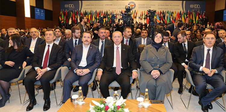 Uluslararası Çalışma Örgütü (ILO) 100. kuruluş yıl dönümünün kutlandığını hatırlatan Cumhurbaşkanı Erdoğan, "Haziran ayında Cenevre'de düzenlenecek 100. yıl zirvesine, eğer programım el verirse ben de katılmayı arzu ediyorum. Bu zirveye hazırlık mahiyetinde gördüğüm, 'İşin Geleceği, Tehditler ve Fırsatlar' konferansının başarılı geçmesini temenni ediyorum. Teklif, tenkit ve tespitleriyle konferansa katkı sunacak tüm katılımcılara şimdiden teşekkürlerimi sunuyorum" ifadelerini kullandı.