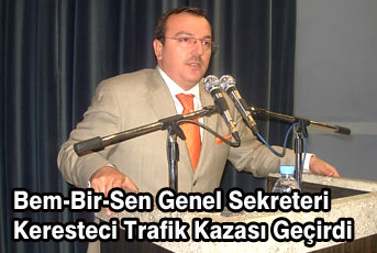 Çorum ve Amasya’da sendikal çalismalari yürütmek için önceki gün Çorum’a giden Belediye ve Özel Idare Çalisanlari Birligi Sendikasi (Bem-Bir-Sen) Genel Sekreteri Ibrahim Keresteci, sabah saatlerinde Mecitözü yakinlarinda aracinin takla atmasi sonucu kaza geçirdi.