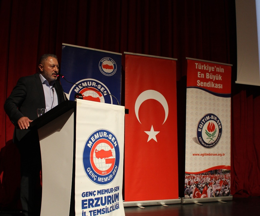Eğitim Bir-Sen Erzurum 2 No’lu Şube Başkanı Mustafa Karataş, Sezai Karakoç’un ‘Göklerden Gelen Bir Karar Vardır’ adlı şiirini okuyarak başladığı konuşmasında, böyle bir çalışmada yer almaktan mutluluk duyduğunu söyledi.