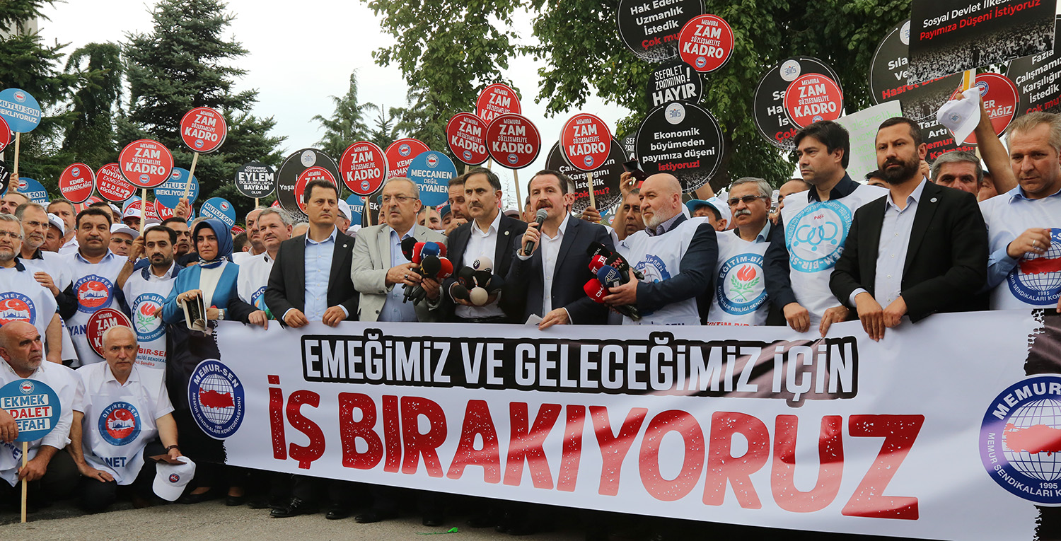 Ankara’da “İş Bırakma” eyleminin ardından, Aile, Çalışma ve Sosyal Hizmetler Bakanlığı önünde ‘cüzdan’lı eylem gerçekleştirdik. Burada bir açıklama yapan Eğitim-Bir-Sen ve Memur-Sen Genel Başkanı Ali Yalçın, masadan çözüm beklediklerini söyledi.