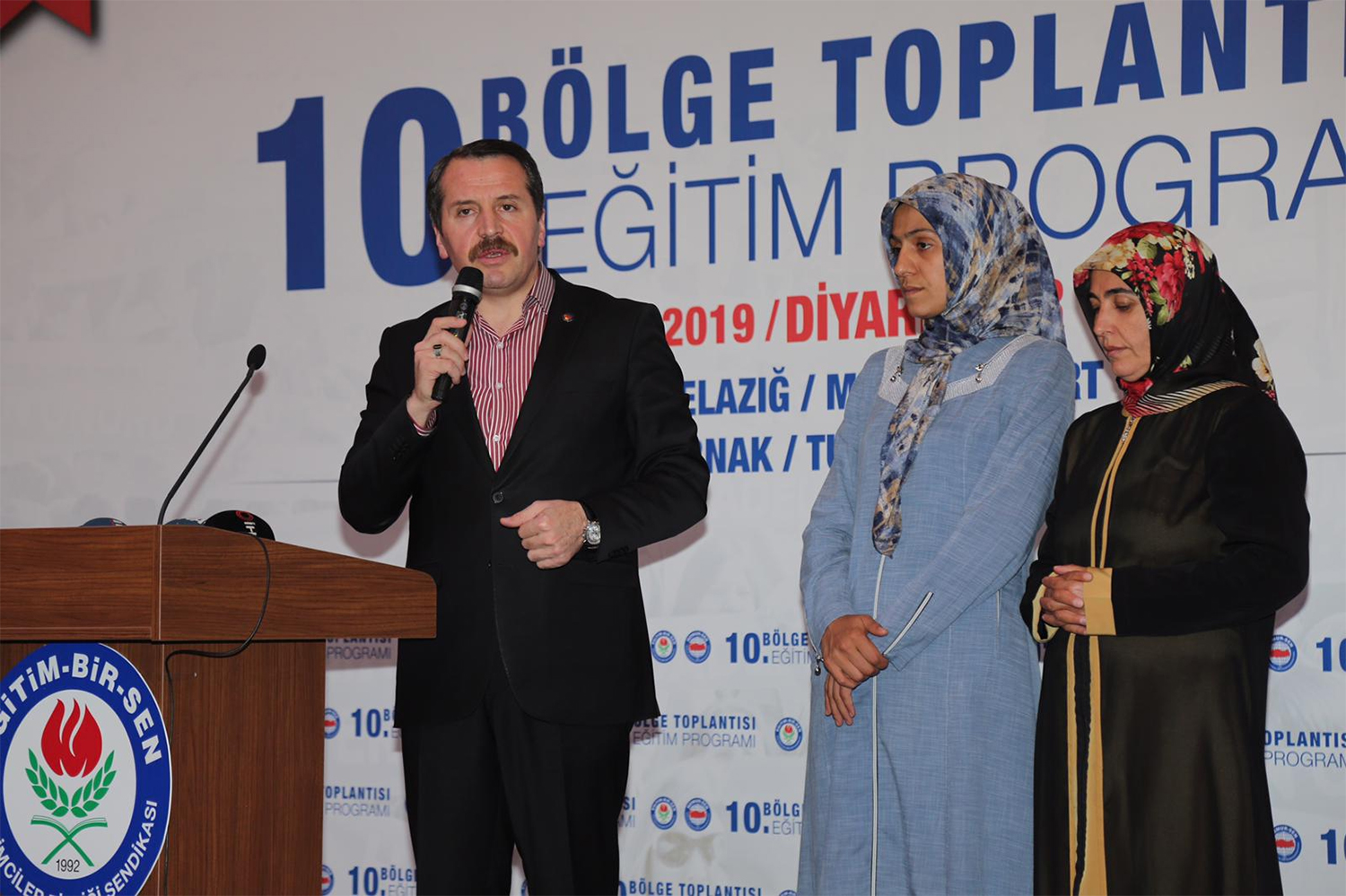 Bugüne kadar 150’den fazla öğretmenin PKK tarafından katledildiğine dikkat çeken Yalçın, “Çukur teröründe bölgede on binlerce okul çağı çocuk eğitimdenmahrum bırakıldı. Çatışmalı bölgelerde bazı okullar eğitim yılı boyunca hiç eğitim veremedi. Yüzlerce okul örgüt üyeleri tarafından tahrip edildi. Okul boykotlarıyla çocuklar eğitimsiz bırakılmak istendi. En küçük bir şeyde kınama yarışına girenler, PKK’nın cürümlerinde suspus oldular. O nedenle diyoruz ki ne ABD ne AB ne de başka bir emperyalist ülkeannelerin, babaların bu acısını anlayamaz.Çünkü onların çıkarı bizim birbirimize düşmemize, daha fazla fakirleşmemize, bu bölgede daha fazla kan akmasına bağlıdır. Onların derdi, burayı daha fazla sömürmek, İsrailbaşta olmak üzere, çıkar ortaklığı yaptığı devletlerin ve kuklaların güvenliğini sağlamak, bunun için de taşeron örgütler üzerinden vekâlet savaşları yürütmektir. Onların derdi, PKK ve benzeri tüm örgütleri emperyalist emelleri için kullanmak, Müslüman Kürtleri emperyalizmin çıkarlarına kurban etmek. İşte bugün bu oyuna en büyük, en etkili, en sahici itirazı Diyarbakır’daki annelerimiz gerçekleştiriyor. Eğitimciler olarak, Necmettin öğretmenini, Aybüke öğretmenini kaybetmiş, bunun gibi yüzlerce kardeşini yitirmiş bir kitleyiz. Biz bu acıyı biliyoruz. Biz bu yürek yangınını tanıyoruz. Bu yangının terörü, terörizmi, vicdansızlığı, namussuzluğu yakıp yok edecek güçte olduğunu da biliyoruz. Ve biliyoruz ki bu ülkede terör bitecekse, bunu annelerin samimi direnişi, yürekliliği ve merhameti bitirecektir” ifadelerini kullandı.