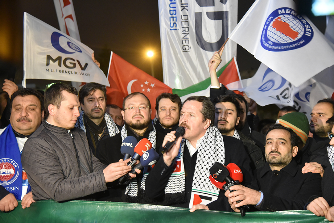 Memur-Sen Yönetim Kurulu üyeleri, Memur-Sen’e bağlı sendikaların başkanları, Anadolu Gençlik Derneği, Milli Gençlik Vakfı ve Milli Türk Talebe Birliği yöneticilerinin katıldığı eylemde konuşan Eğitim-Bir-Sen ve Memur-Sen Genel Başkanı Ali Yalçın, “Coğrafyamızda İsrail sorunu var. Yüzyıl önce büyük İsrail planı oyununu bölgemizde kuranlar, bu planlarını adım adım uygulamaya çalışıyorlar ve Filistin devletini adım adım yok etmeye çalışıyorlar” ifadelerini kullandı.