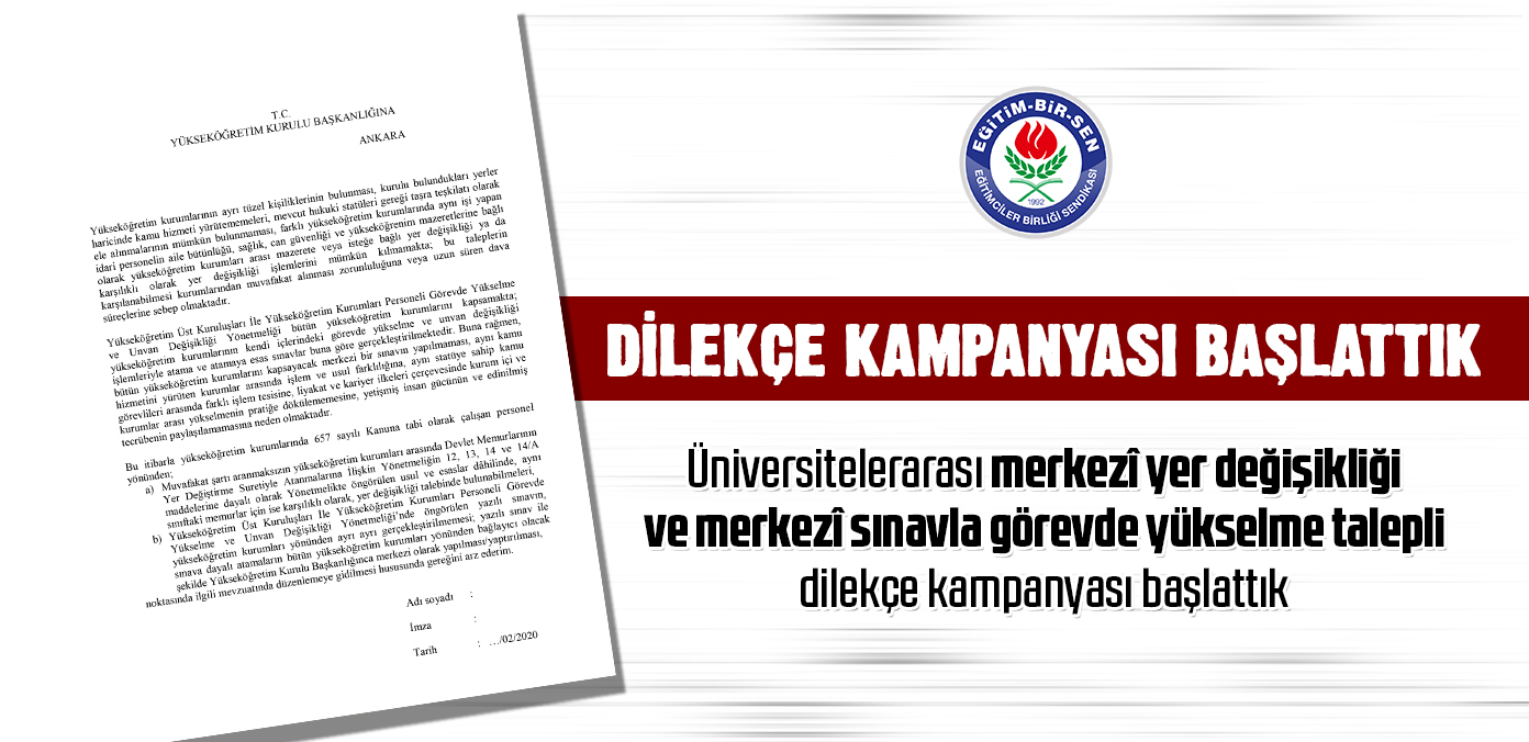 Eğitim-Bir-Sen olarak, üniversitelerdeki idari personel için, mazerete ve isteğe bağlı merkezî yer değişikliği ile görevde yükselme süreçlerinde merkezî sınav ve atama gerçekleştirilmesi noktasında düzenleme talebiyle dilekçe kampanyası başlattık.