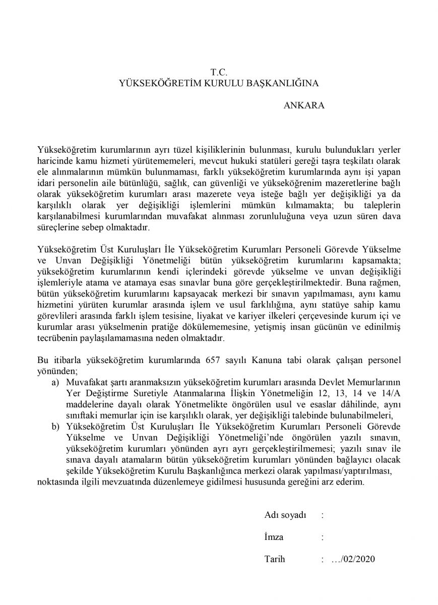 (b) Yükseköğretim Üst Kuruluşları ile Yükseköğretim Kurumları Personeli Görevde Yükselme ve Unvan Değişikliği Yönetmeliği’nde öngörülen yazılı sınav ile sınava dayalı atamaların, bütün üniversiteler yönünden bağlayıcı olacak şekilde YÖK tarafından merkezî olarak yapılması/yaptırılması noktasında ilgili mevzuatında düzenlemeye gidilmesi hususunda dilekçe kampanyası başlattık.