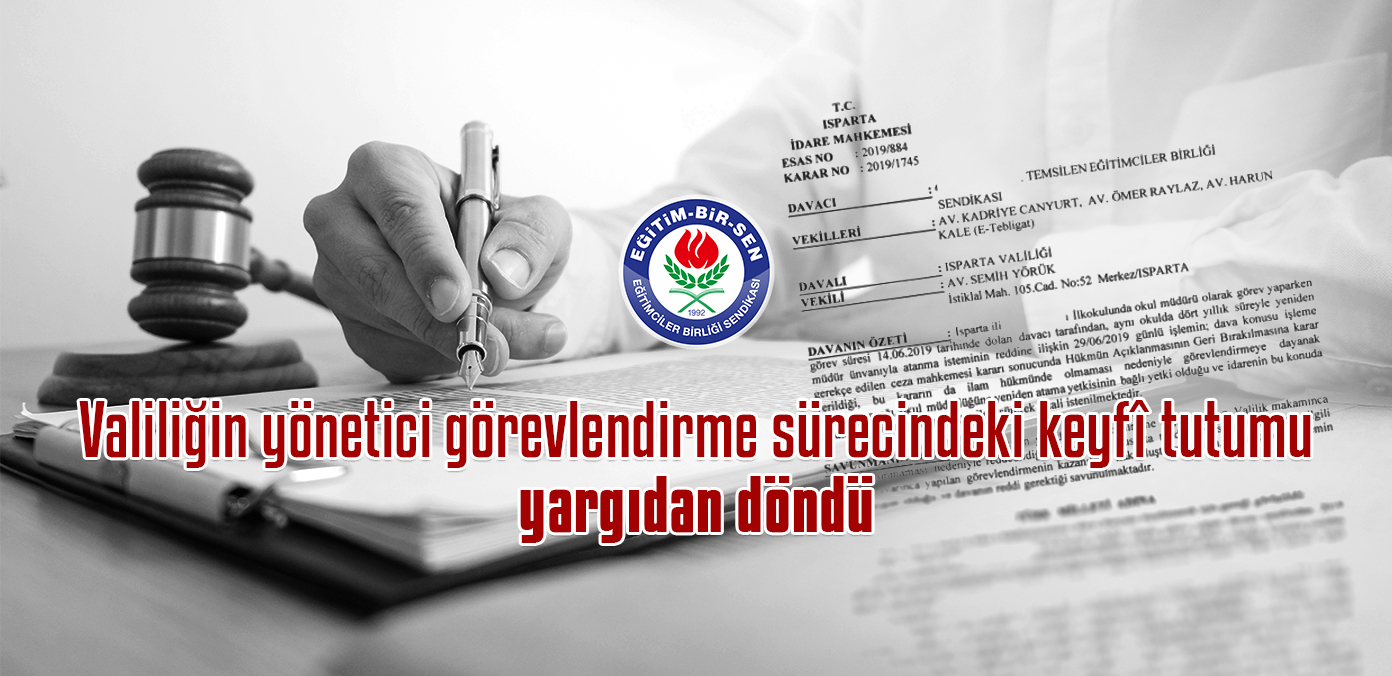 Eğitim-Bir-Sen olarak, adli bir olay nedeniyle yargılanmakta olduğu ceza davası gerekçe gösterilerek okul müdürü üyemizin görev süresinin uzatılmaması üzerine açtığımız davada, mahkeme, ilgili yönetmelikte, davacı hakkındaki güvenlik soruşturmasının olumsuz olarak değerlendirilmesinin yeniden müdür olarak atanmasına tek başına engel bir durum teşkil edeceğine yönelik bir düzenlemeye yer verilmediğinden hareketle işlemi iptal etti.