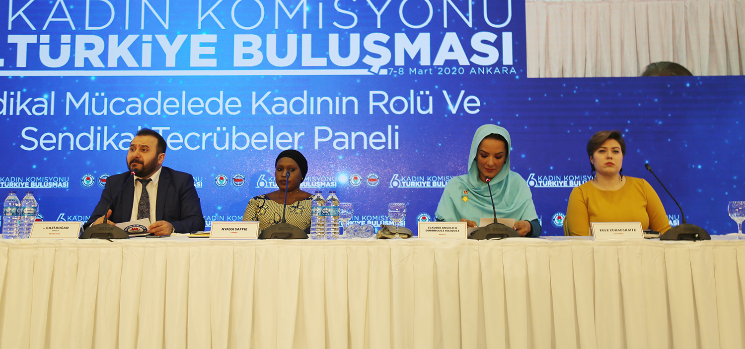 “Sendikal Mücadelede Kadının Rolü ve Uluslararası Sendikal Tecrübeler” başlıklı oturumda Meksika İşçi Partisi Milletvekili Claudia Dominguez, Gambiya Öğretmenler Sendikası Başkan Yardımcısı ve Kadın Komisyonu Başkanı Saffie Nyassi, Litvanya Eğitim, Bilim ve Kültür Sendikası Başkan Yardımcısı Egle Zugauskaite, ülkelerindeki sendikal faaliyetler ve kadınların çalışma hayatındaki rolleri hakkında bilgi verdiler.