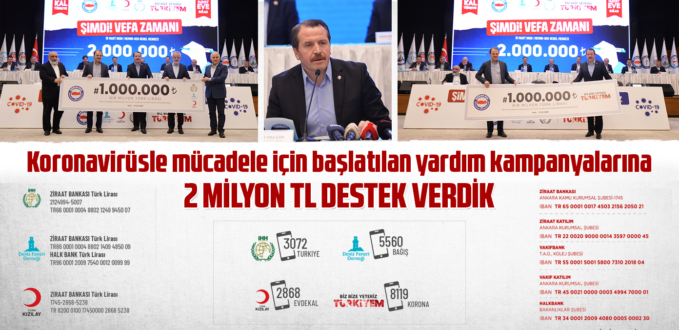 Koronavirüsle mücadele kapsamında, Cumhurbaşkanı Recep Tayyip Erdoğan’ın çağrısıyla başlatılan ‘Millî Dayanışma Kampanyası’na 1 milyon TL, ‘Şimdi Vefa Vakti’ kampanyasıyla da İHH, Deniz Feneri ve Kızılay’a 1 milyon TL olmak üzere toplamda 2 milyon TL’lik bağışta bulunduk.