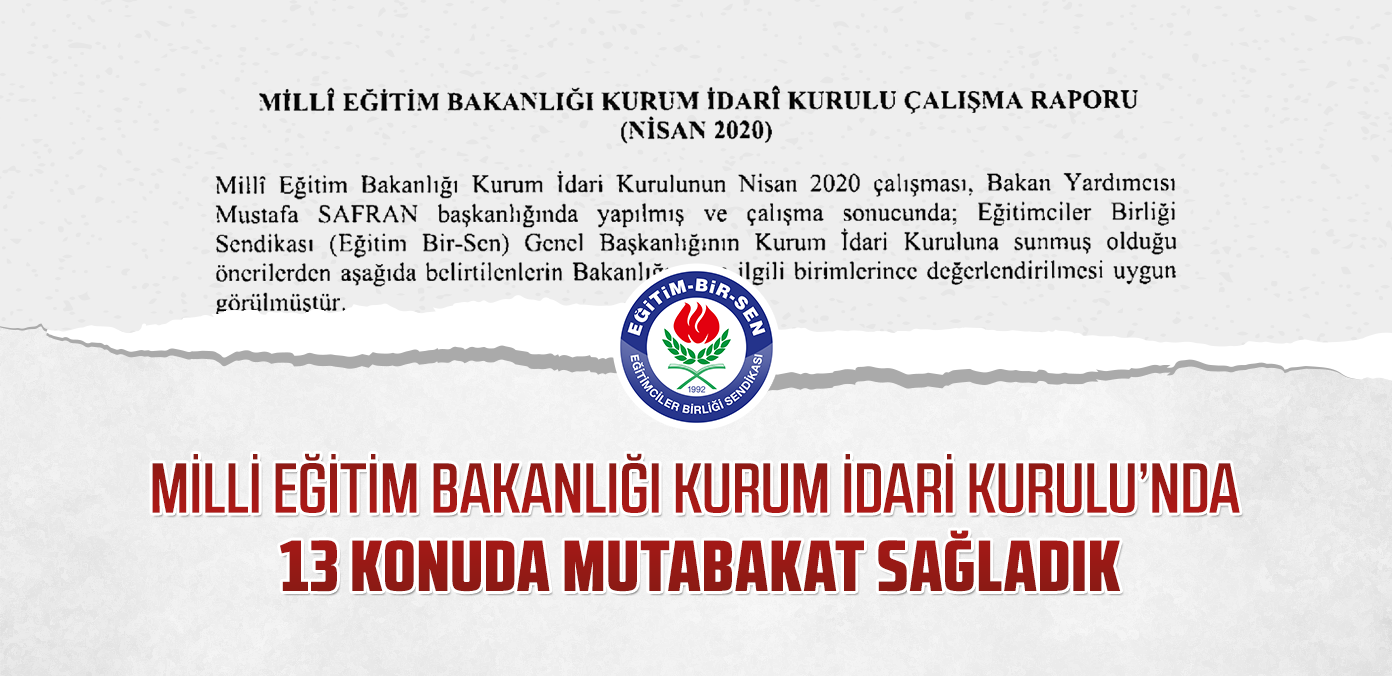Eğitim-Bir-Sen olarak, Millî Eğitim Bakanlığı ile Kurum İdari Kurulu (KİK) Nisan 2020 toplantısında 13 konuda çalışma yapılması hususunda mutabakat sağladık.