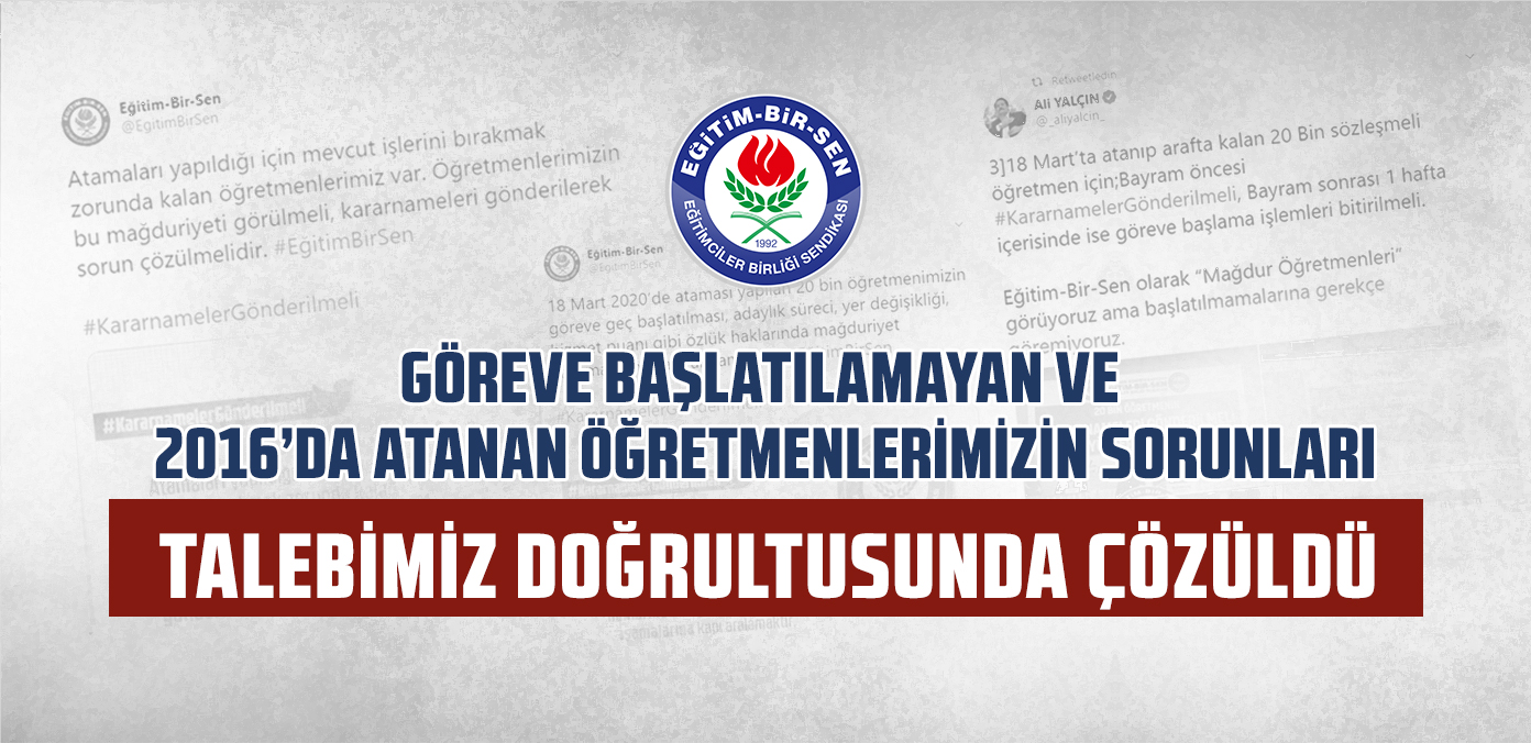 Eğitim-Bir-Sen olarak, 18 Mart’ta atanan 20 bin öğretmenin göreve başlamasının daha fazla zamana yayılmaması çağrısında bulunmuş; Bakanlığa bu hususta başvuruda bulunarak, “Öğretmenlerimizin kazanılmış hakları salgın sürecinde zemine yayılmamalı, kararnameleri gönderilerek hakları zamanında verilmeli, yüzleri güldürülmelidir” demiştik.
