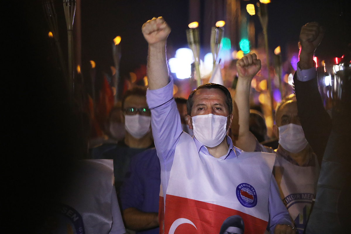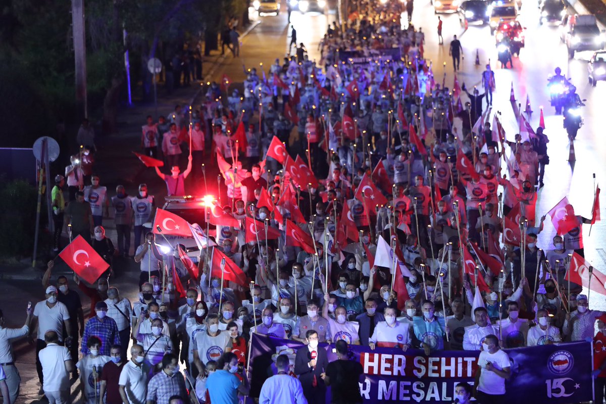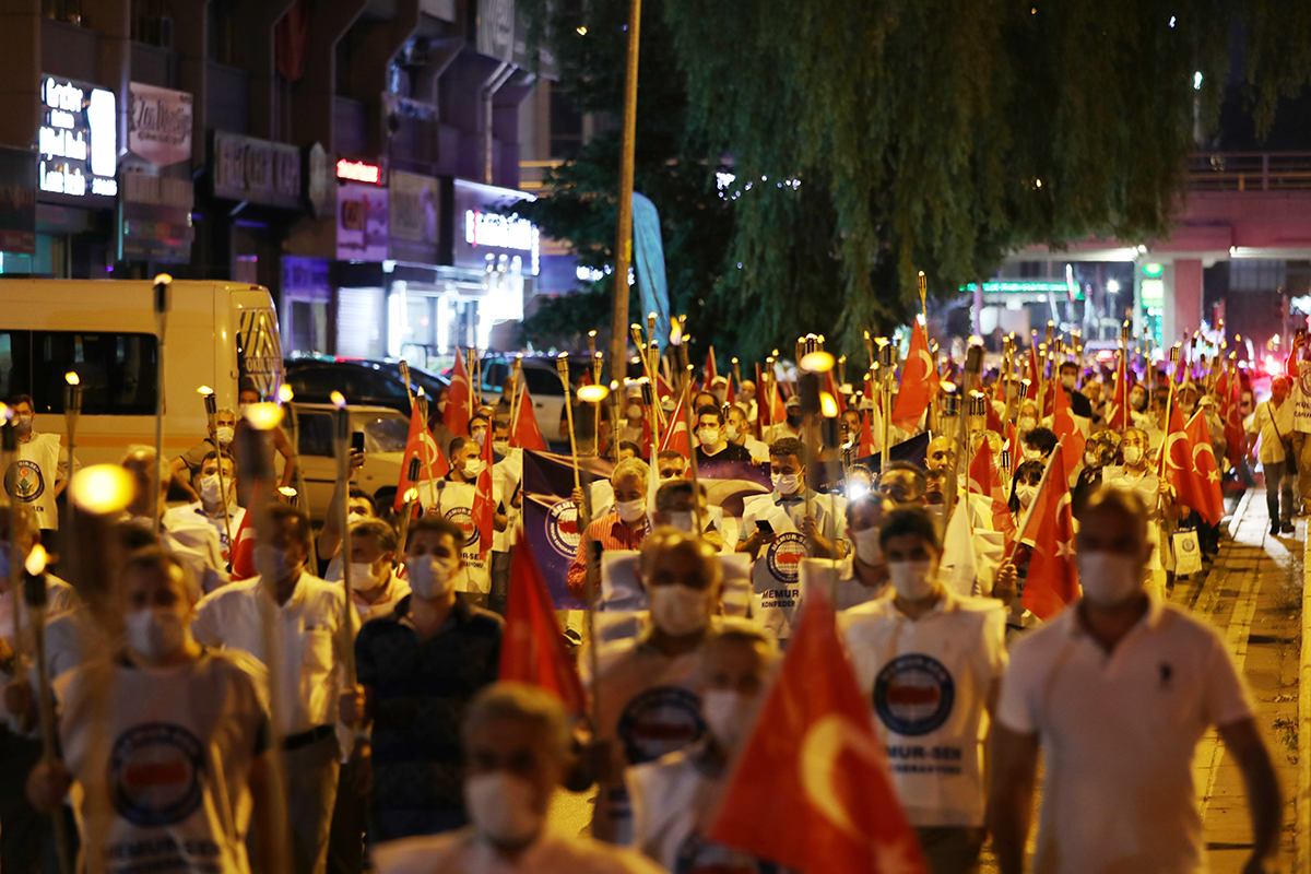 Yürüyüşün sonunda açıklama yapan Genel Başkan Ali Yalçın, 15 Temmuz’da bulunulan hain darbe girişiminin taşeronluğunu FETÖ’nün üstlendiğini ve planın da okyanus ötesinde hazırlandığını söyledi. Yalçın, “Türkiye’yi kaosa ve iç savaşa sürüklemeyi, millete diz çöktürmeyi hedefleyen bu hain planda 8 binden fazla askeri personel, 35 uçak, 37 helikopter, 74 tank, 246 zırhlı araç, 3 askeri gemi millete karşı kullanıldı. Gözü dönmüş hainler, küresel efendileri adına millete ve milletin kurumlarına alçakça saldırdılar. Meclis, Cumhurbaşkanlığı Külliyesi, Özel Harekât Daire Başkanlığı, Emniyet Genel Müdürlüğü, MİT, TRT ve birçok kurum saldırıya uğradı; Genelkurmay, 15 Temmuz Şehitler Köprüsü, TRT ve onlarca kurum işgal edildi. Hesapta önceki darbeler gibi millet sessiz kalacak, ülke teslim olacaktı ama ülkenin yiğit evlatlarının tarihî direnişi ve Allah’ın yardımı bütün planları bozdu. 15 Temmuz gecesi bütün dünya; meydana yüreklerini koyanlarla, ihanetlerini koyanların, çekirdek çitleyip televizyondan darbeyi izleyenlerle, abdest alıp tanklara direnenlerin, milletin silahını millete çevirenlerle, milletine göğsünü siper edenlerin mücadelesine şahit oldu. O gün millet coşkun bir ırmak gibi, iradesinin önüne örülmüş bentleri yerle bir etti. 251 kardeşimiz şehadet makamına erişti. 2 binden fazla kardeşimiz yaralandı ve gazilik mertebesine ulaştı” dedi.