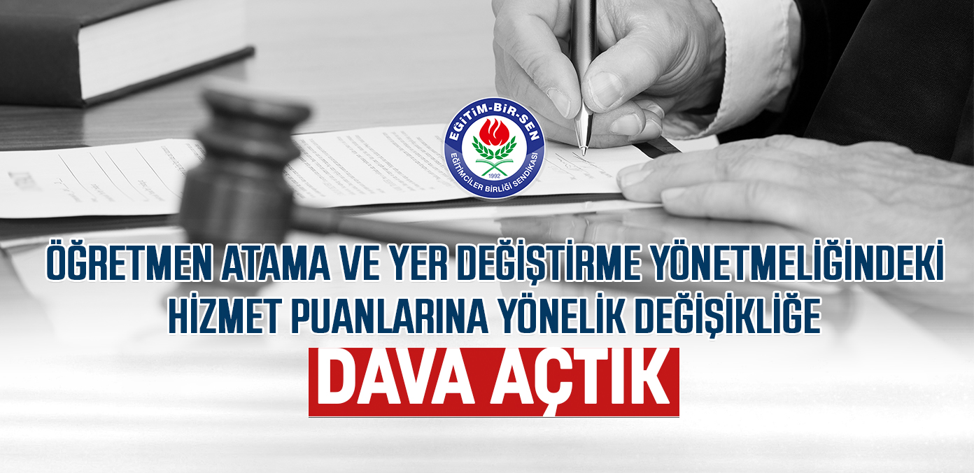 Eğitim-Bir-Sen olarak, öğretmen atama ve yer değiştirme yönetmeliğindeki yüksek lisans mezuniyetine verilen hizmet puanında tezli-tezsiz ayrımı yapılması ile takdir-teşekkür-aylıkla ödül belgelerinin puanlama dışında tutulmasını dava konusu ettik.