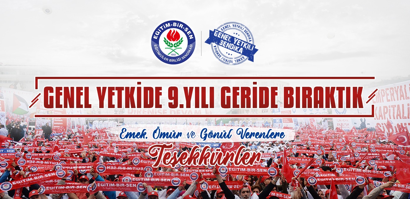 Eğitim-Bir-Sen, örgütlü olmanın hak ve adalet yolunda diri ve güçlü olmak anlamına geldiğine inanarak çıktığı yolda, eğitim çalışanlarının haklarının korunması ve geliştirilmesi mücadelesinde genel yetkide 9. yılı geride bırakmış bulunmaktadır.