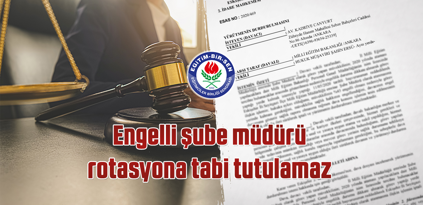 Eğitim-Bir-Sen olarak, bölge hizmetine bağlı yer değişikliği kapsamında görev yeri değiştirilen engelli şube müdürü üyemiz adına açtığımız davada, mahkeme, Devlet Memurlarının Yer Değiştirme Suretiyle Atanmalarına İlişkin Yönetmelik’in Ek 3. maddesi hükmüne atıfla, engellilik durumu devam ettiği sürece kurumlarca isteği dışında memurun görev yerinin değiştirilemeyeceğine hükmetti.